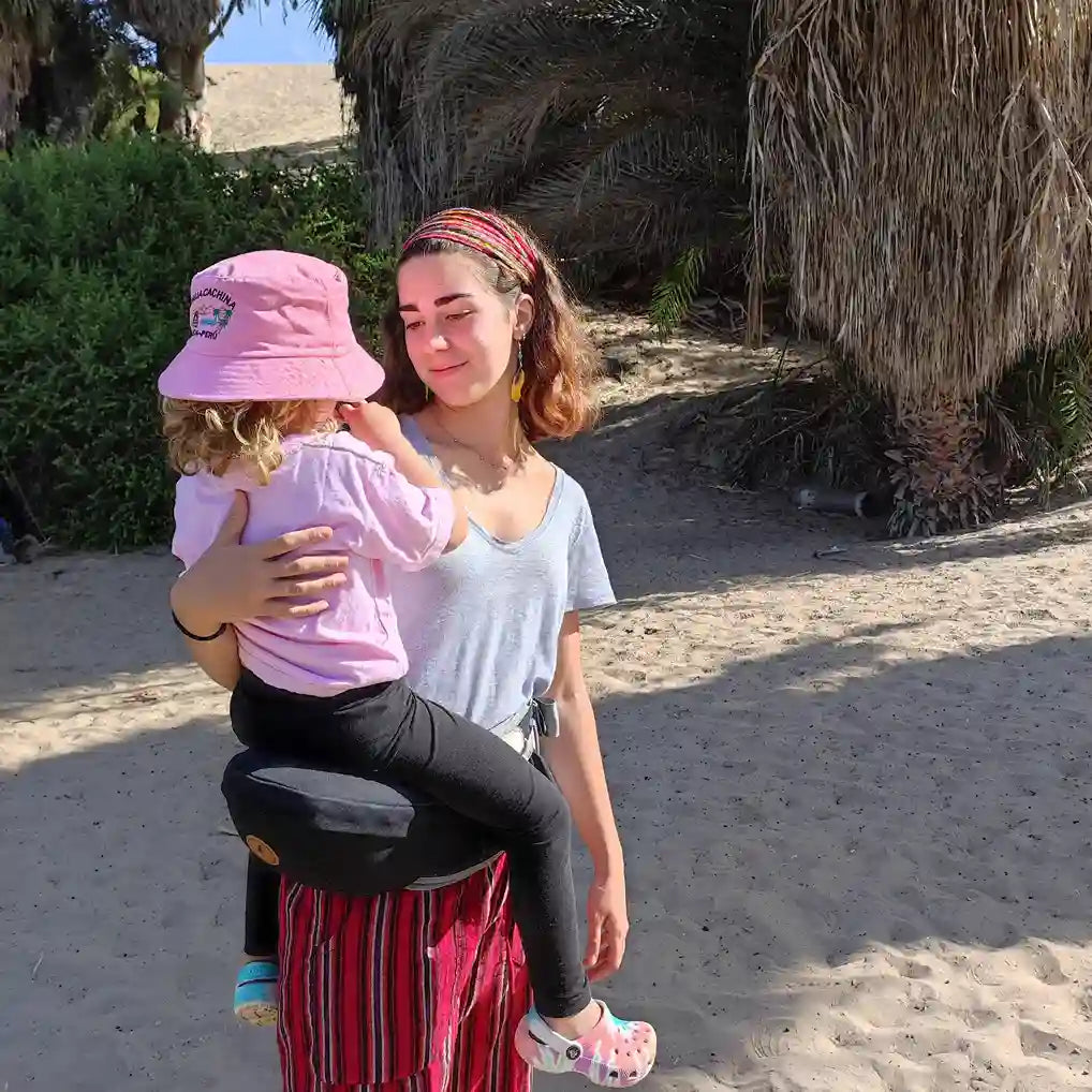 Banquito fijado a la cadera del adulto para sentar a bebé o niño(a) pequeño(a) en él, cargándolo como “en brazos”.