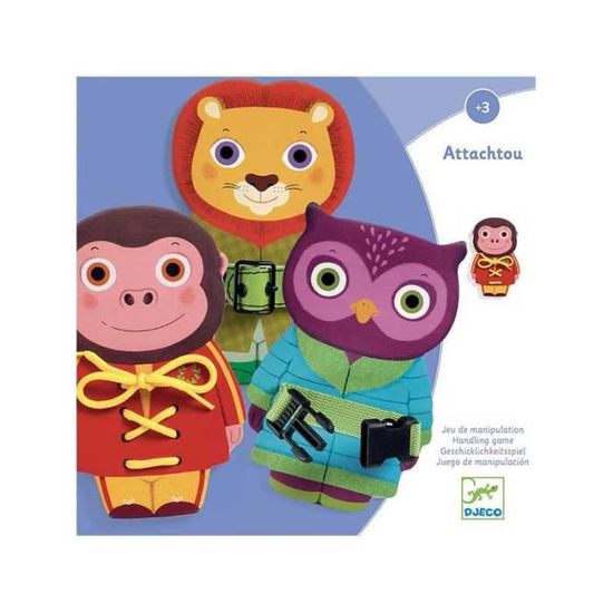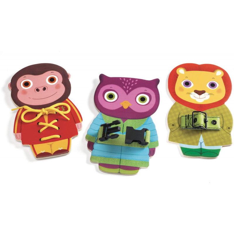Un juego de destreza manual compuesto de tres animales de madera (mono, buho y leon). Divirtiendose con cada uno de ellos abrochando y desabrochando sus prendas de tela).