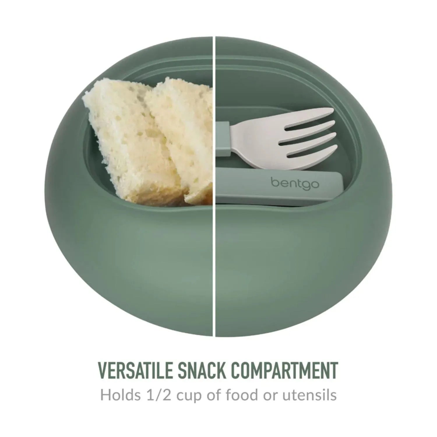 Plato superior para aderezos y refrigerios: el compartimento superior del tazón Bentgo tiene capacidad para ½ taza de aderezos y refrigerios pequeños, a la vez que proporciona un espacio conveniente para almacenar el juego de utensilios retráctiles incluido