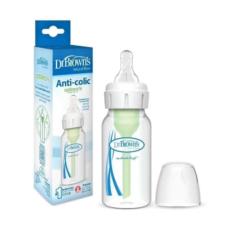 Biberón de Polipropileno Boca Estrecha 4 oz/120ml, con tetina de flujo lento nivel 1. Lleva un sistema de ventilación interna anticólicos clínicamente probado para reducir los cólicos. Disminuye la saliva, eructos y gas.La alimentación sin vacío es la más cercana a la lactancia materna y los pezones de silicona Dr. Brown’s proporcionan un flujo constante para que los bebés puedan alimentarse a su propio ritmo. Seguro para su uso en lavavajillas (solo estante superior), esterilizadores eléctricos y de microondas o agua hirviendo. Sin BPA. Edad recomendada: 0 meses a más.