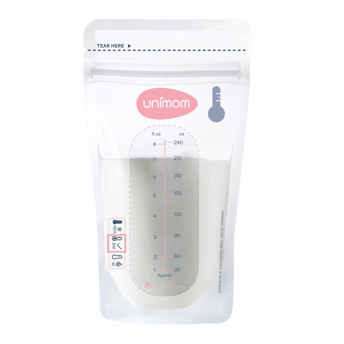 Las bolsas para leche materna premium Unimom son a prueba de fugas están diseñadas para ocupar menos espacio y hacer que almacenar y transportar la leche materna sea fácil y eficiente. Libres de BPA y con cierre Zip Lock que mantendrá el contenido libre de bacterias, povo o humedad. La caja contiene 50 bolsas pre esterilizadas con capacidad de 240ml/8oz (por bolsa) y tienen un sensor térmico que se marcará cuando el contenido esté a la temperatura adecuada (READY). El material de estas bolsas está especialmente seleccionado por su calidad, siendo un plástico apto para el almacenamiento de alimentos y libre de BPA.