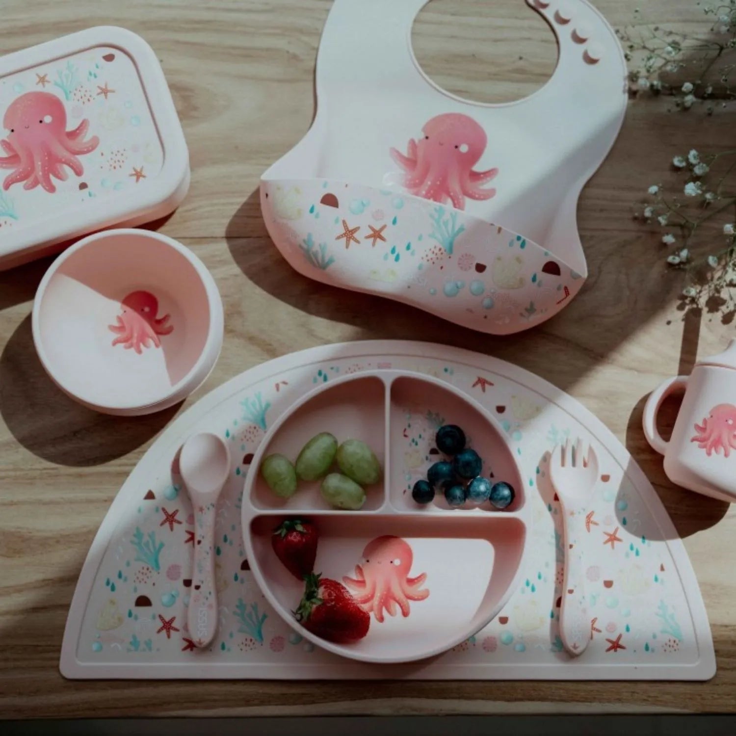 El tazón de silicona de Slurpy El Pulpo, para bebés es perfecto para sus primeras comidas de adultos. Sus paredes altas facilitan que el bebé coma solo, mientras que su base con ventosa garantiza su seguridad.
