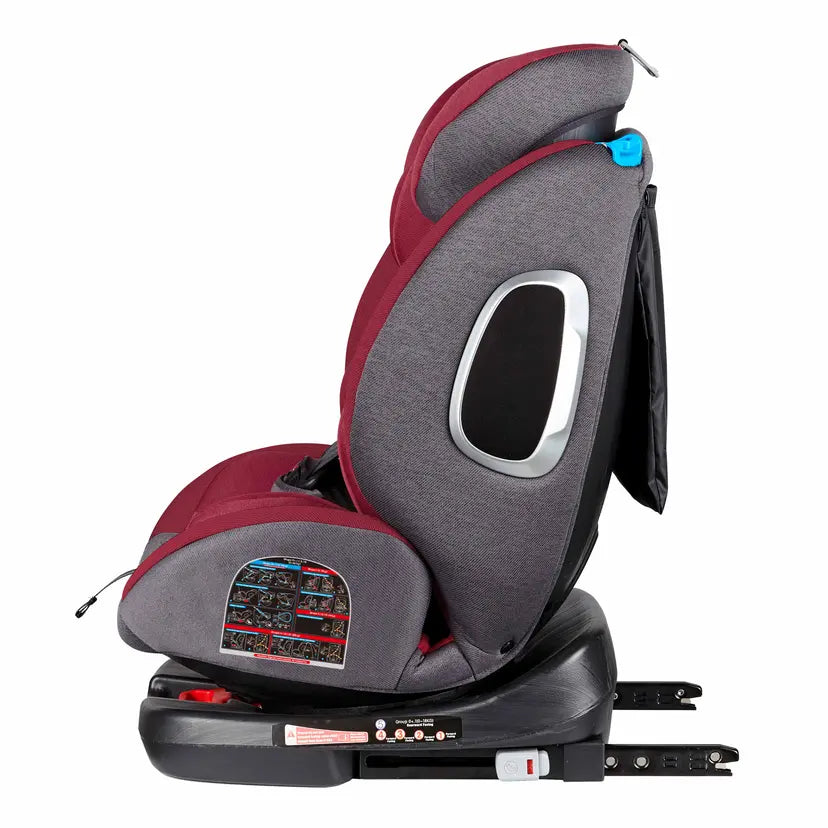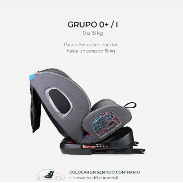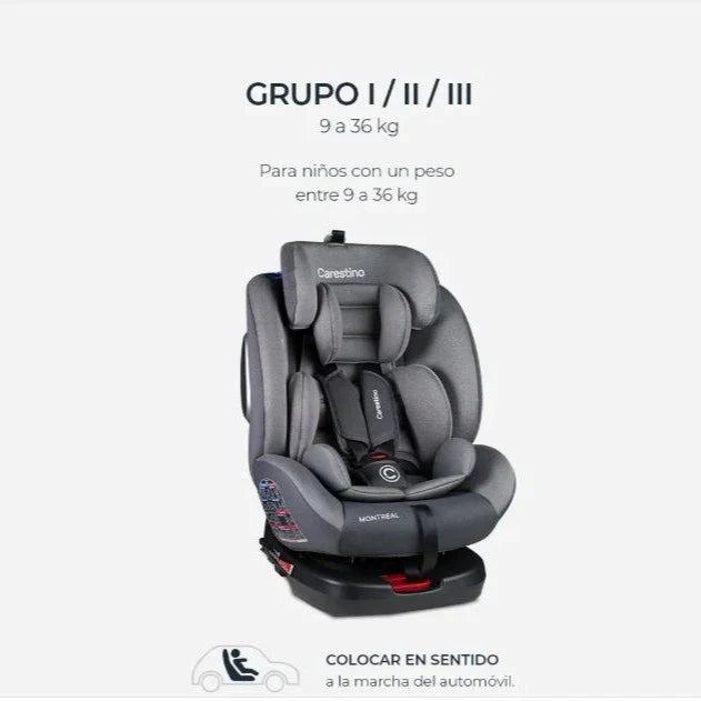 La butaca MONTREAL posee sistema de giro de 360º, lo cual facilita la colocación y retirada del niño en la butaca, brindándole también mayor comodidad a los padres. Será la compañera ideal para realizar los viajes de manera confortable y segura junto a tu bebé. Su sistema de anclaje ISOFIX y guías de cinturón que se encuentran señalizadas en color, nos permiten lograr una rápida, sencilla y correcta instalación en el automóvil. Cuenta con un cabezal de fácil ajuste regulable en varias posiciones de altura, esto permite adaptar la silla de auto a la altura adecuada para proteger la cabeza del niño, alcanza una altura máxima de 65 cm desde el asiento al cabezal, además posee 4 posiciones de respaldo que brindan una excelente comodidad para el niño a la hora de viajar. Posee un arnés de seguridad de 5 puntos que sujeta hombros y cadera del bebe, además, posee almohadillas acolchadas. El Grupo de0+-/I va dese los 0 a 18 kg, y el Grupo I/II/III ENTRE 9 a 36 kg. Especificaciones: ⟷ Asiento: 25 cm de ancho, ⟷ Respaldo: 24 cm de ancho, ⟷ Apoyacabezas: 22 cm de ancho, ↥ Altura máxima respaldo: 62 cm, ↥ Altura mínima respaldo: 52,5 cm.