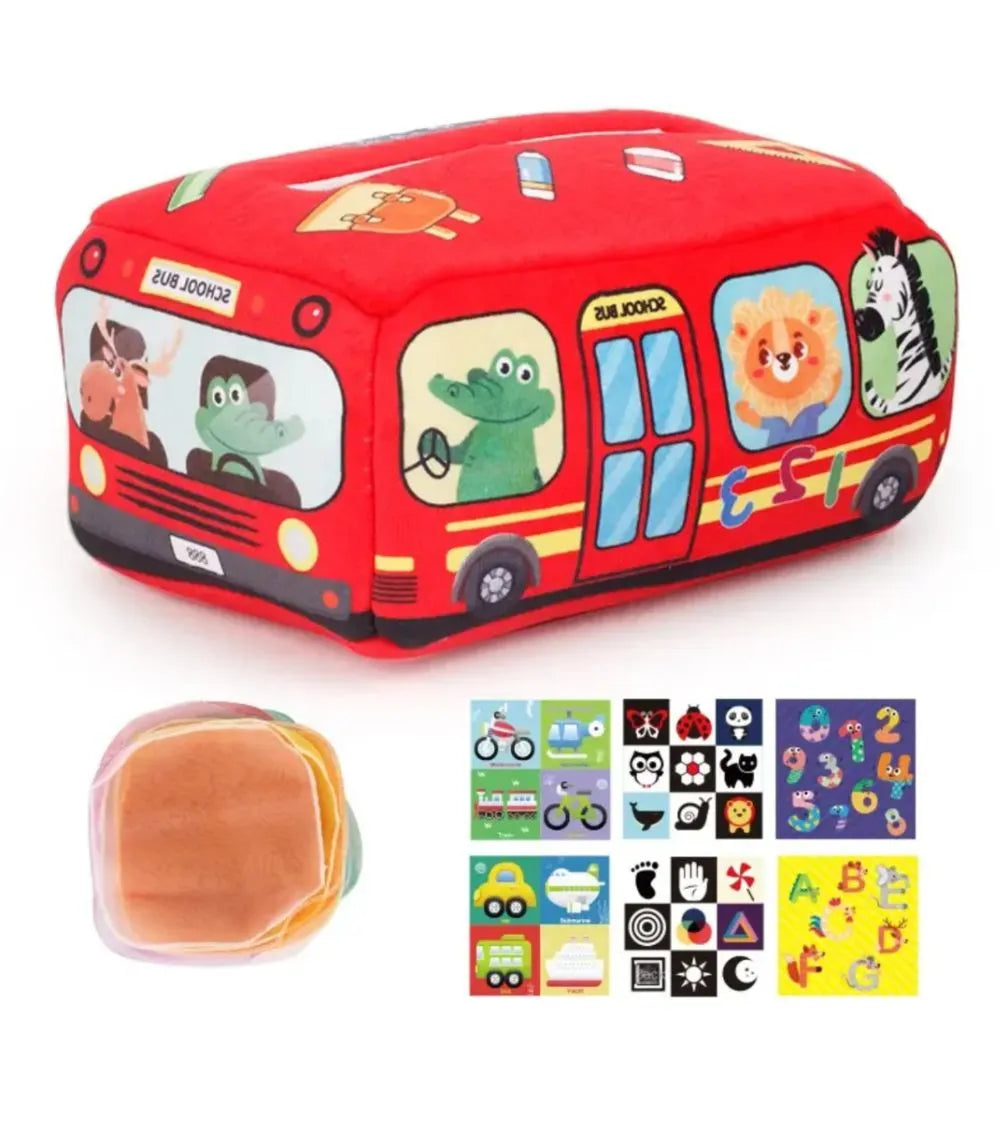 Cajita Sensorial Bus Escolar contiene en su interior diferentes telas con diseños de animales, números y pañuelos con texturas, para una experiencia sensorial que tu bebé disfrutará.