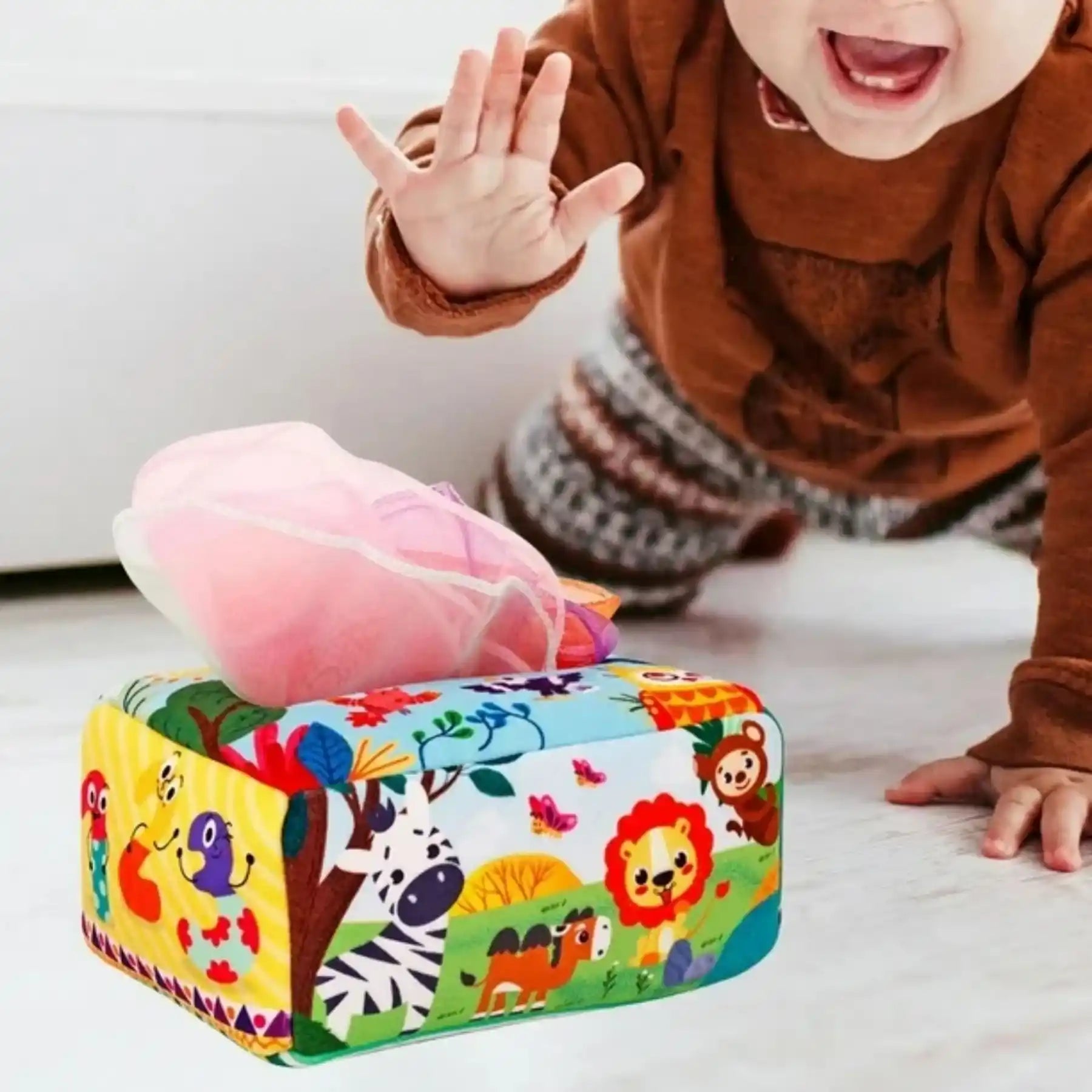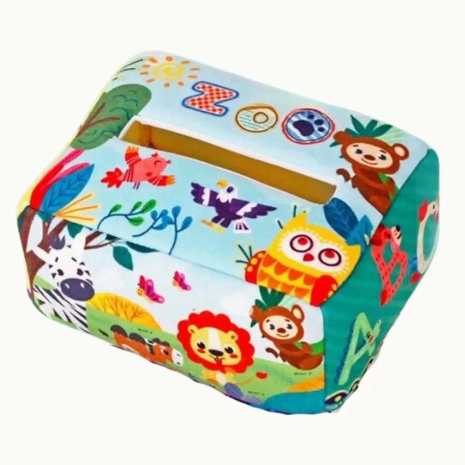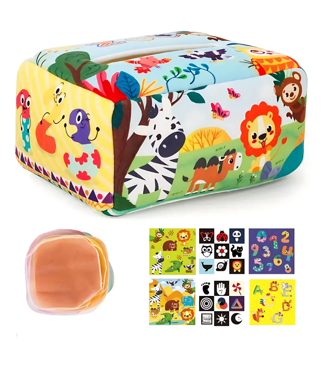 Cajita Sensorial zoológico feliz contiene en su interior diferentes telas con diseños de animales, números y pañuelos con texturas, para una experiencia sensorial que tu bebé disfrutará.