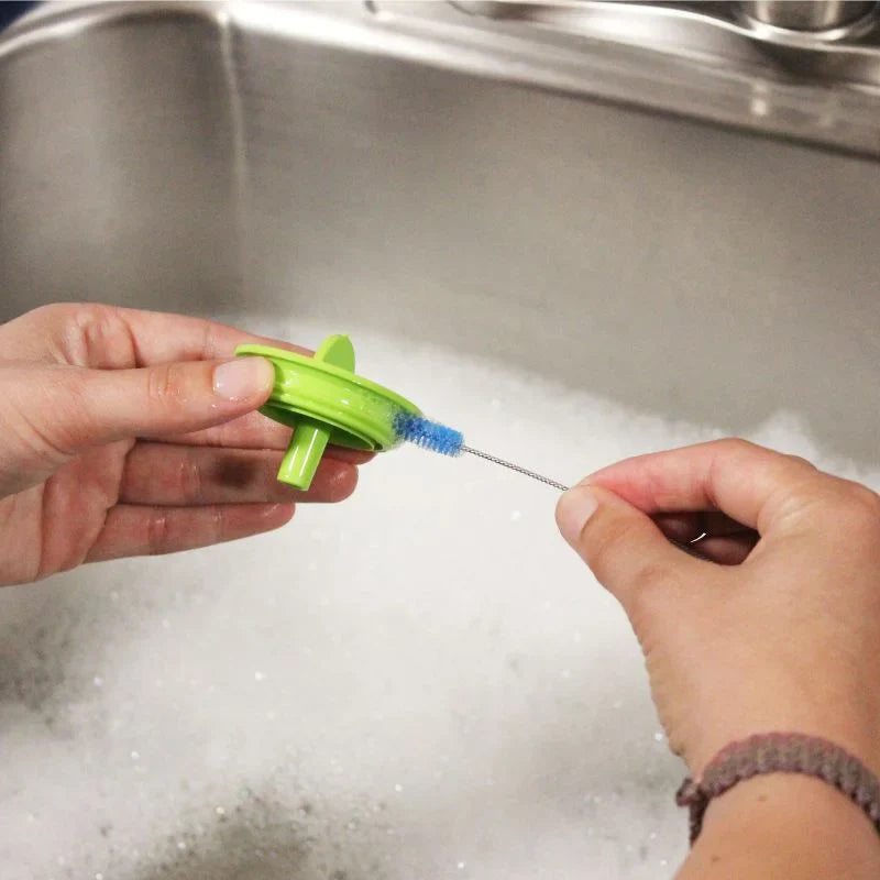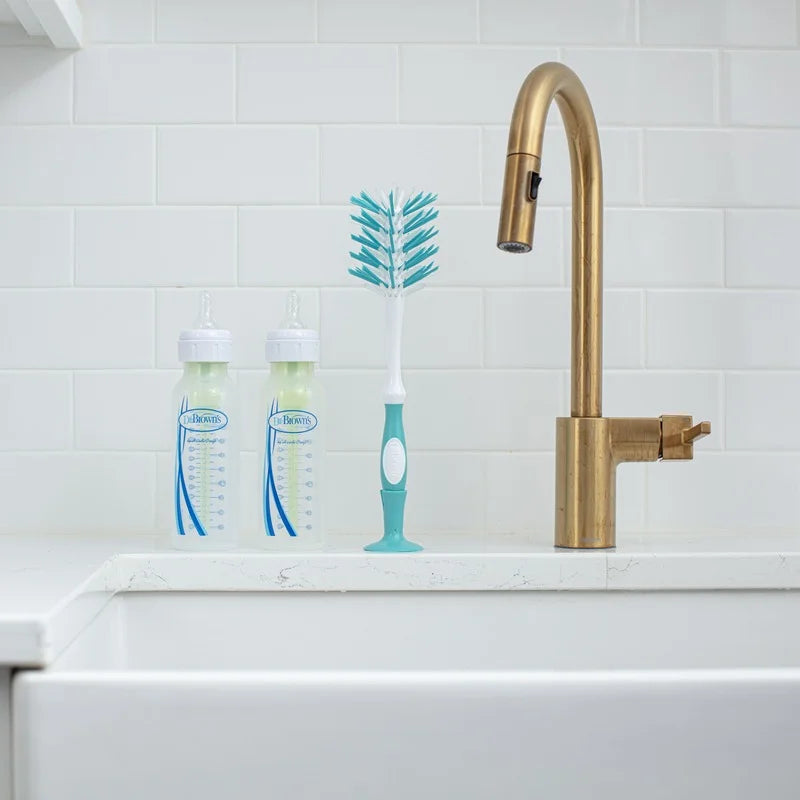 El cepillo de Limpieza Deluxe + Cepillo de Filtros, son ideales para usarlos con todos los biberones Dr. Brown’s. Mango antideslizante y ergonómico cuenta con una superficie multicapa para un agarre cómodo y resistencia a la flexión o flexión. La base de la ventosa se puede utilizar para colocar el cepillo en posición vertical o quitar la ventosa y engancharla al interior de tu fregadero. Cepillo de ventilación incluido. Utiliza el pequeño cepillo de limpieza incluido para frotar los componentes internos en botellas Dr. Brown’s y otros lugares difíciles de alcanzar. Se adapta a la mayoría de los biberones. Sin BPA. Apto para lavavajillas (solo estante superior).