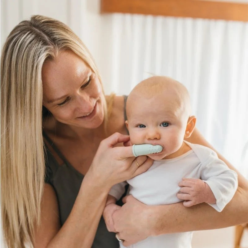 El Cepillo de dientes de 100% silicona con estuche de Dr. Brown´s, posee una superficie texturizada que masajea las mejillas del bebé y las cerdas de silicona suaves, pero resistentes limpian con cuidado las encías y los dientes que están saliendo del bebé. (Alivia el dolor de encías).