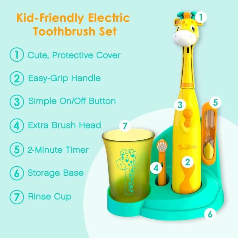 El nuevo cepillo de dientes favorito de tu hijo, que está diseñado desde 3 años o más para promover una higiene bucal saludable. Las cerdas suaves de alta calidad proporcionan una suave vibración que elimina el doble de placa que un cepillo de dientes manual. No contiene BPA y está certificado como seguro para niños. Contiene: cepillo de dientes para niños a batería, cubierta de cepillo con temática animal, cabezal de cepillo de repuesto que debe ser cambiado cada 3 meses, vaso de enjuague y un temporizador de arena de 2 minutos.
