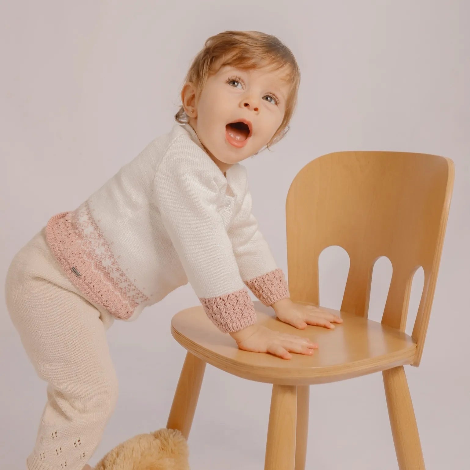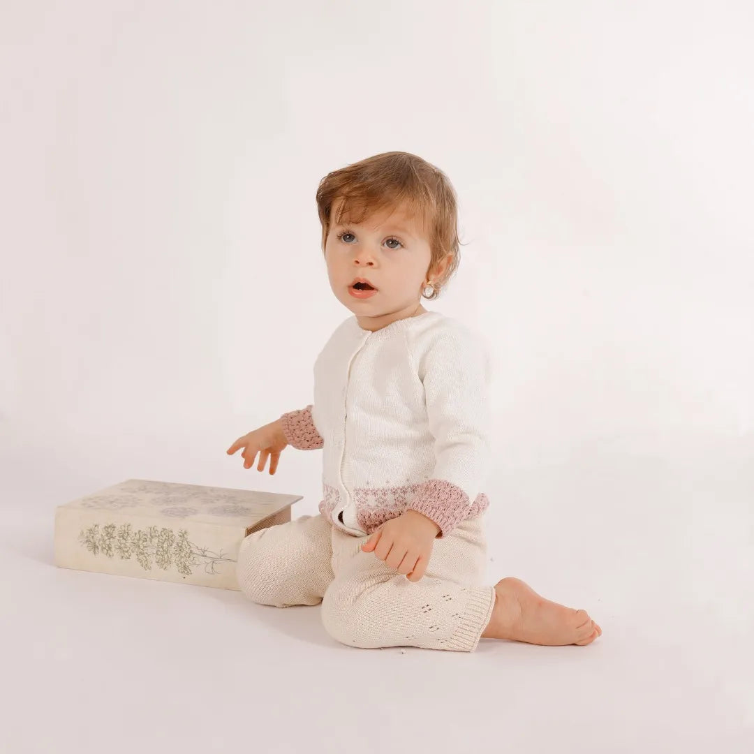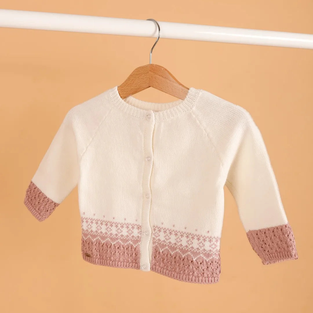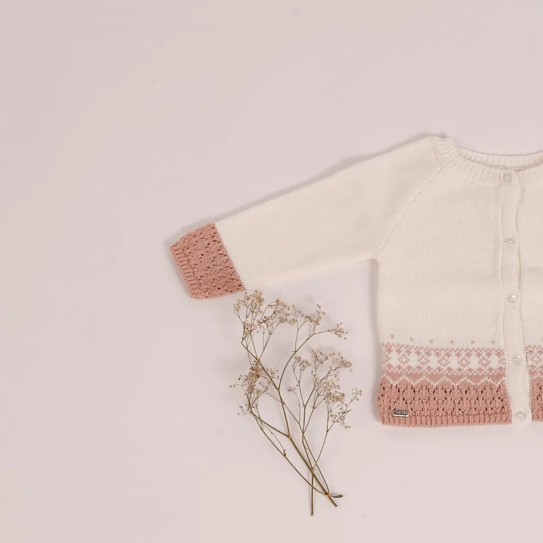 Chaqueta Lia, tejida con hilo de algodón suave. Diseño adorable con toques de rosa en mangas y basta que le dan un toque tierno y femenino. Perfecta para mantener abrigado y con estilo a tu pequeña.