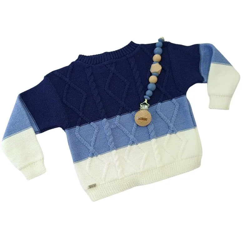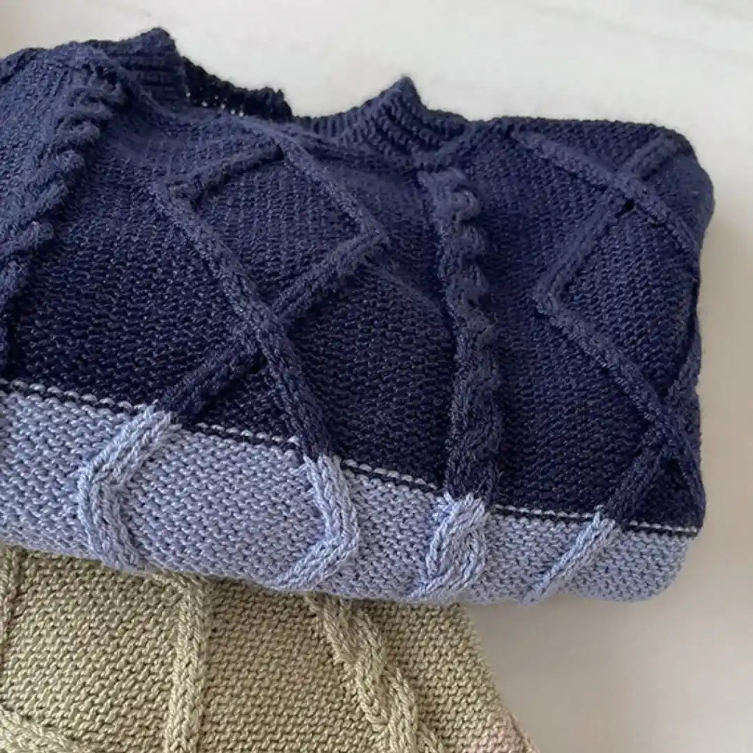 Conjunto de bebé tejido en dos piezas, con suéter de punto decorado con rombos en relieve y pantalón a juego. Ideal para mantener a tu pequeño abrigado con estilo y total comodidad. Una opción encantadora para el día a día o eventos especiales.