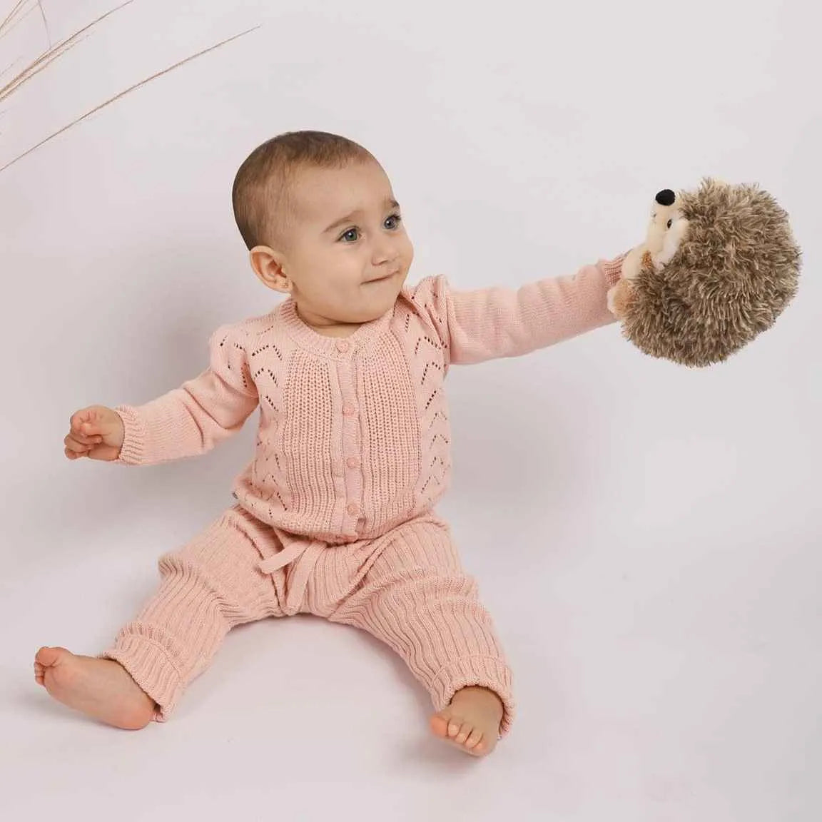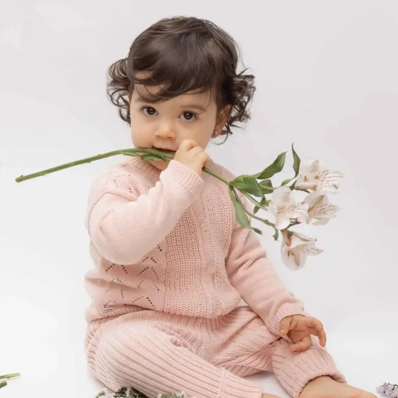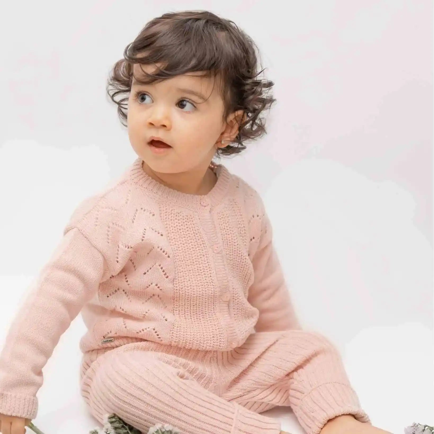 Encantador conjunto de dos piezas tejido en hilo de algodón, ideal para mantener a tu bebé cómodo y con estilo. El suéter presenta un delicado diseño calado en forma de zigzag y cierre de botones, acompañado de un pantalón tejido a juego. Perfecto para climas templados y ocasiones especiales.