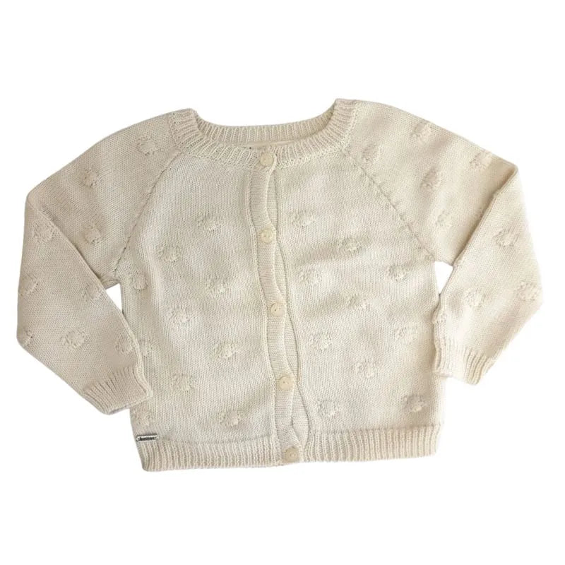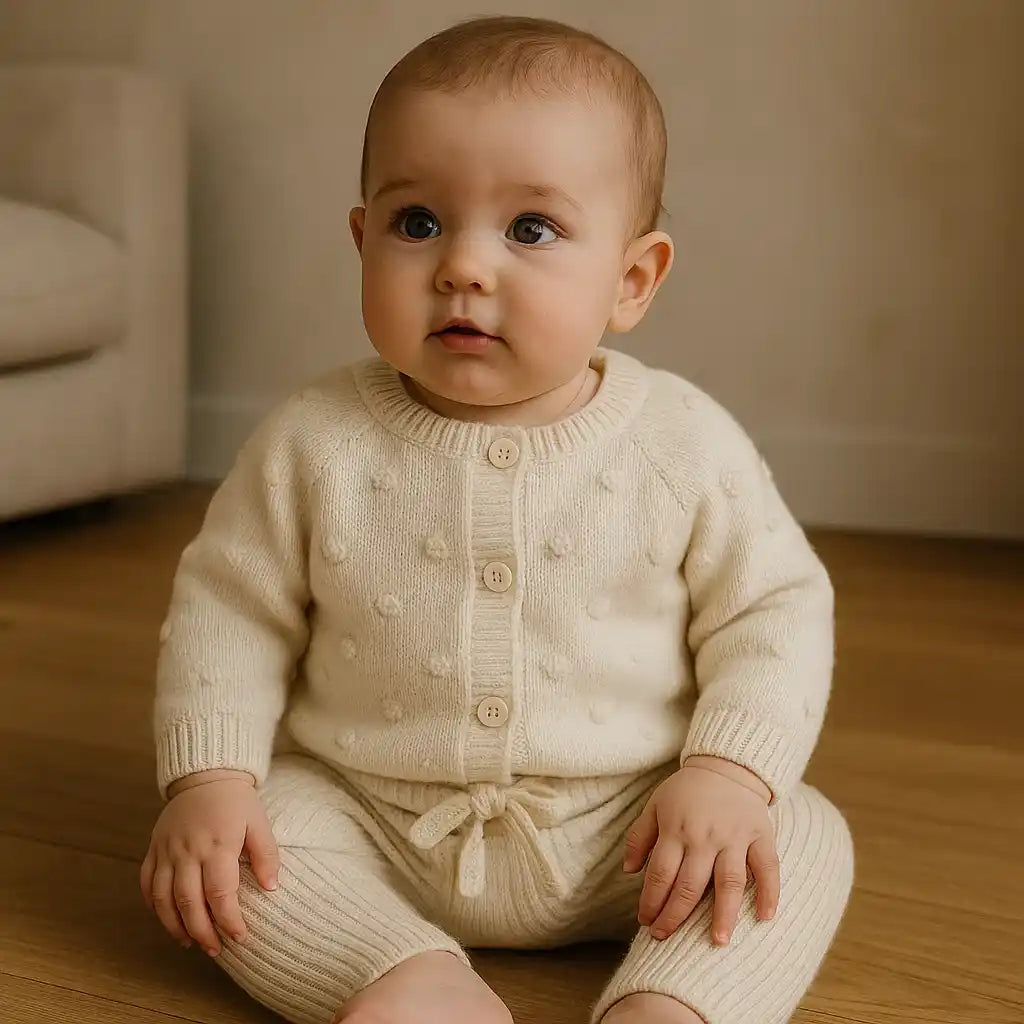 Suave y delicado conjunto de dos piezas tejido en hilo de algodón, ideal para la piel sensible del bebé. Incluye un suéter con cierre de botones y un diseño en punto relieve que le da un toque tierno y elegante, acompañado de un pantalón a juego. Perfecto para mantener a tu pequeño abrigado con estilo y comodidad.