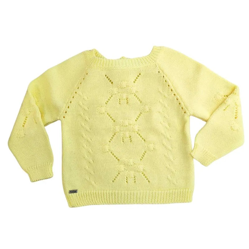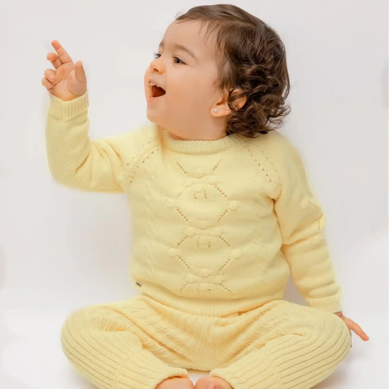 Este delicado conjunto tejido de dos piezas para bebé está confeccionado con hilo suave y respirable, ideal para mantenerlo cómodo y abrigado. El suéter de manga larga y el pantalón presentan un elegante diseño calado con motivos florales en relieve que aportan un toque artesanal y encantador. Perfecto para ocasiones especiales o para lucir con estilo todos los días.
