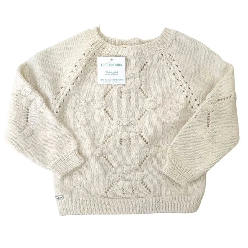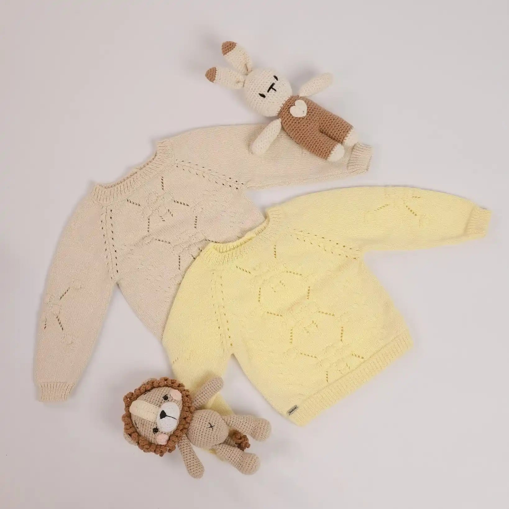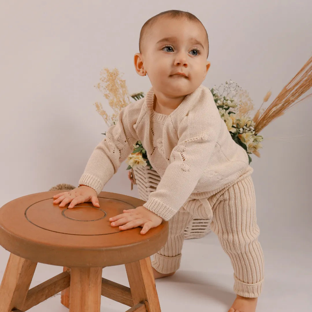 Este delicado conjunto tejido de dos piezas para bebé está confeccionado con hilo suave y respirable, ideal para mantenerlo cómodo y abrigado. El suéter de manga larga y el pantalón presentan un elegante diseño calado con motivos florales en relieve que aportan un toque artesanal y encantador. Perfecto para ocasiones especiales o para lucir con estilo todos los días.