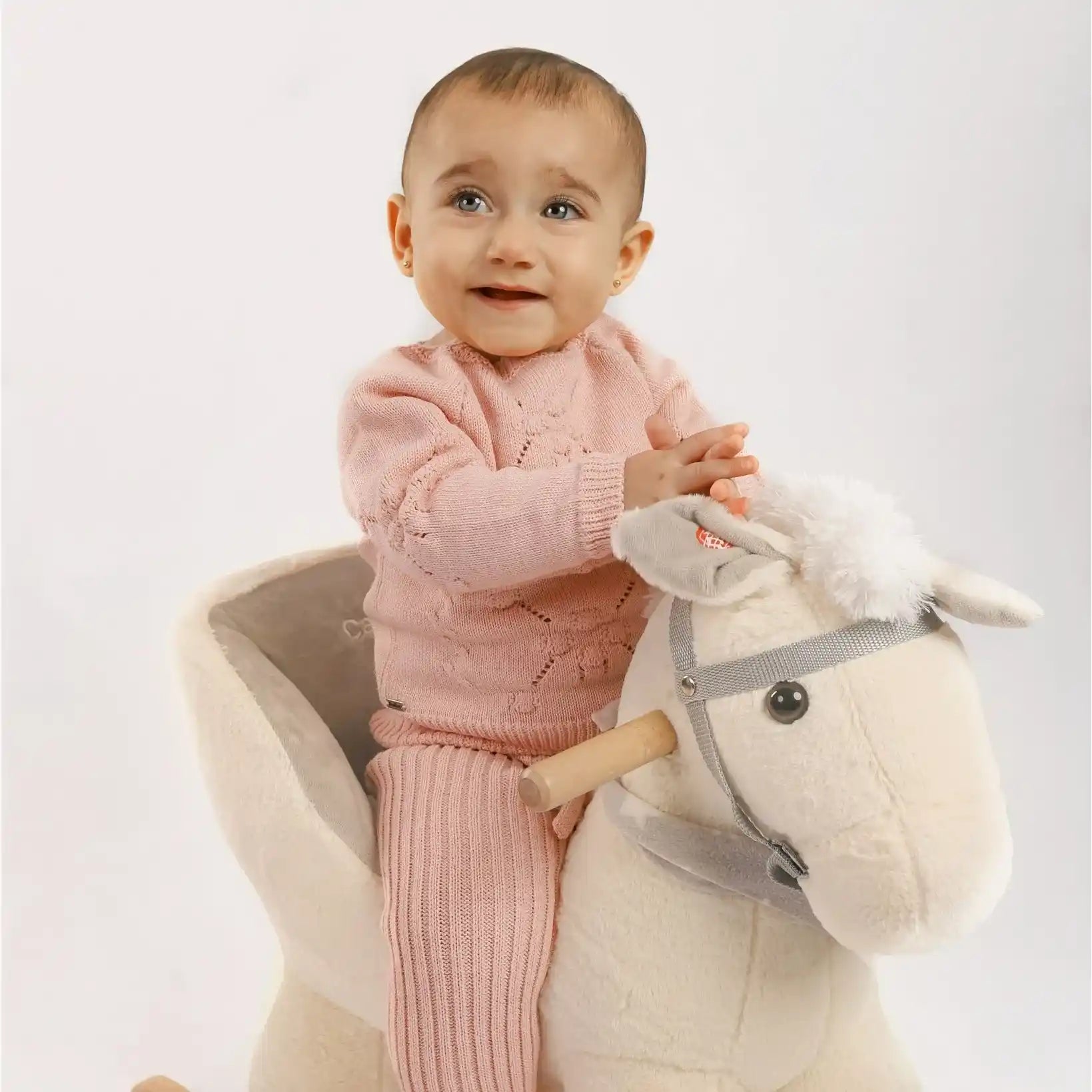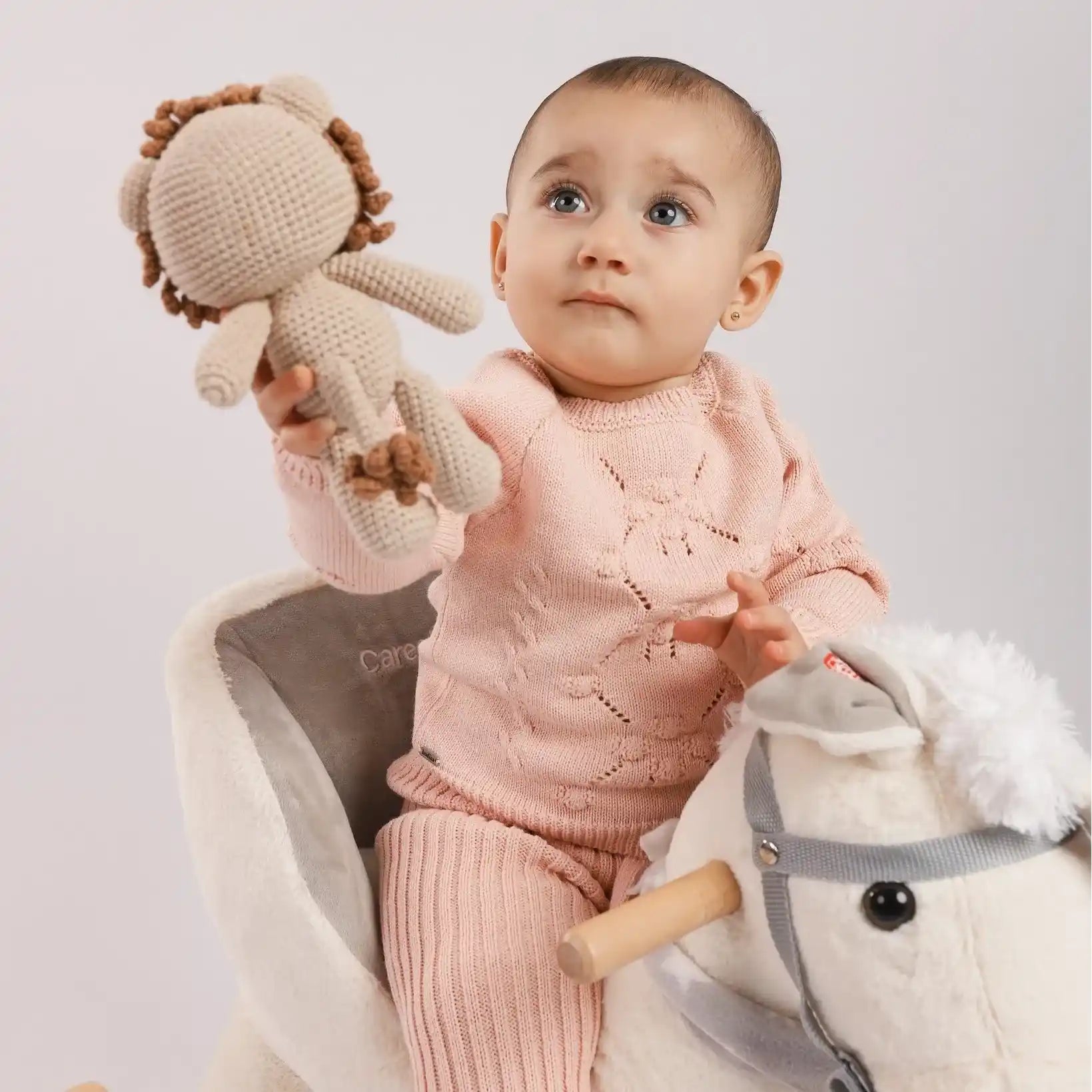 Este delicado conjunto tejido de dos piezas para bebé está confeccionado con hilo suave y respirable, ideal para mantenerlo cómodo y abrigado. El suéter de manga larga y el pantalón presentan un elegante diseño calado con motivos florales en relieve que aportan un toque artesanal y encantador. Perfecto para ocasiones especiales o para lucir con estilo todos los días.