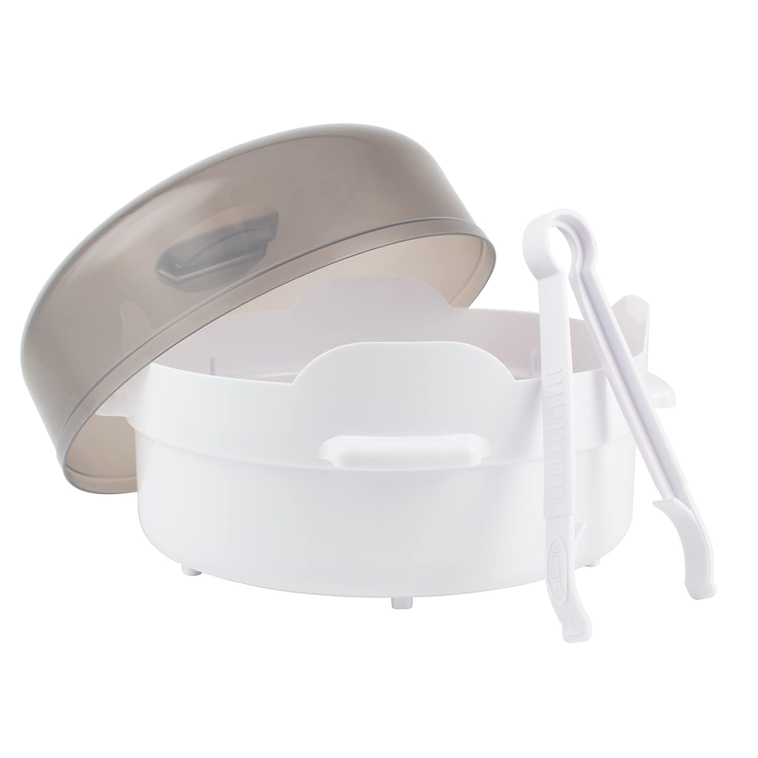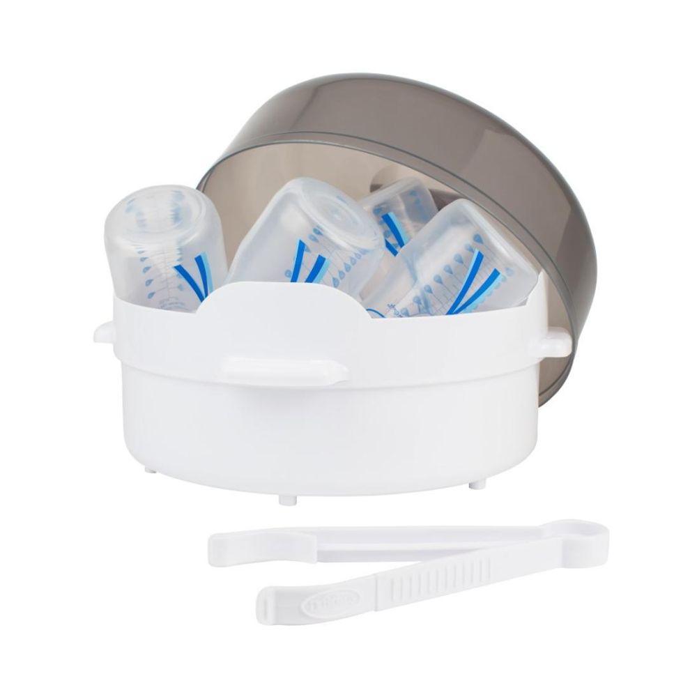 El esterilizador a vapor para microondas de Dr. Brown’s, puede albergar hasta cuatro biberones de todos los tamaños, además de piezas de biberón. Cuenta con una bandeja personalizada extraíble para una fácil limpieza. Limpia biberones y piezas en cuestión de minutos. Pinzas incluidas. Material: Plástico.