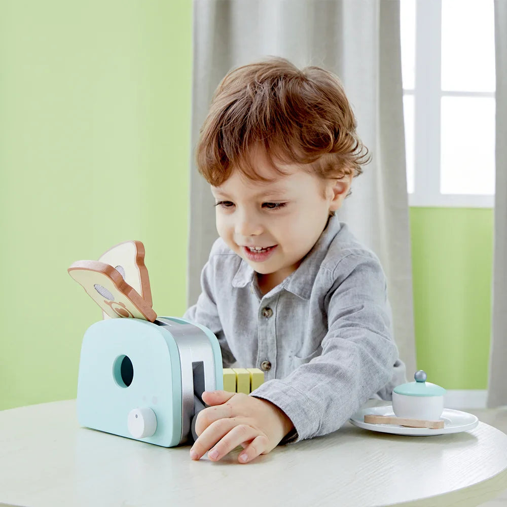 ¡El desayuno es la comida más importante del día! Practiquemos hábitos alimentarios saludables. Este set incluye: tostadas, platos de mantequilla, cuchillos de madera y yogur. También puede fomentar la iniciativa y el juego imaginario de los niños.