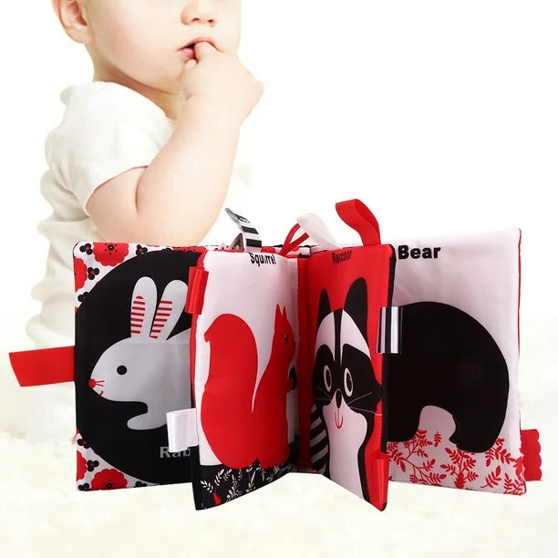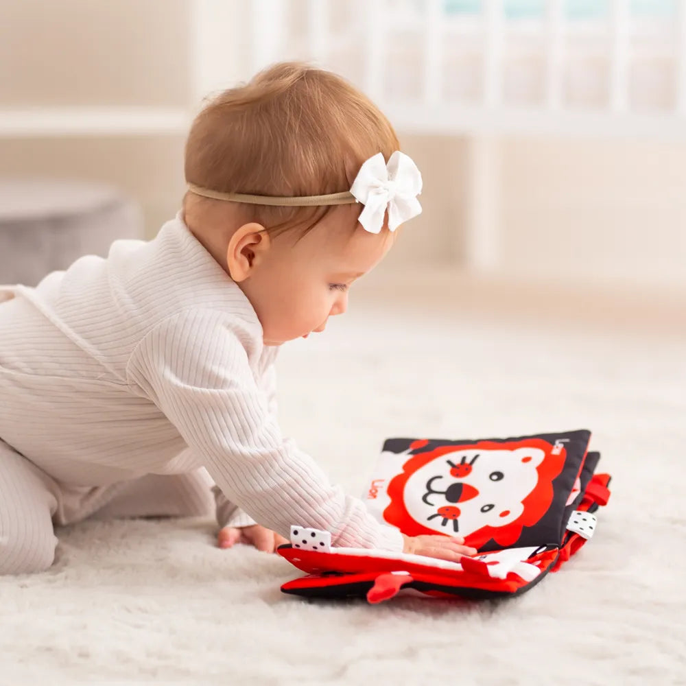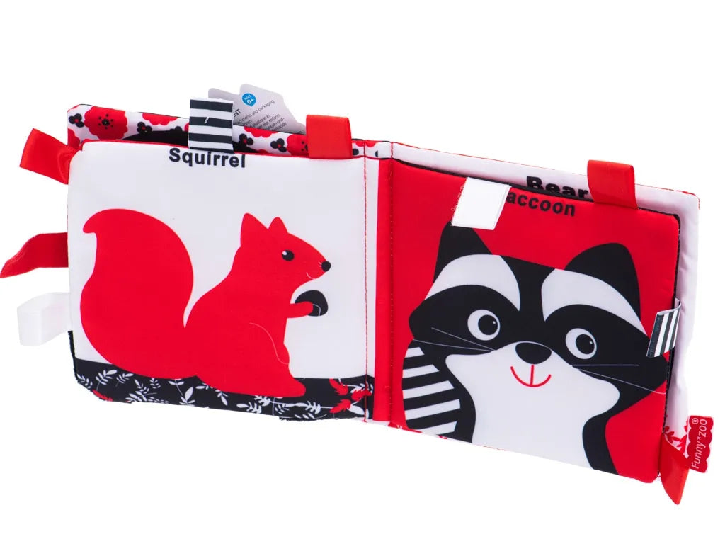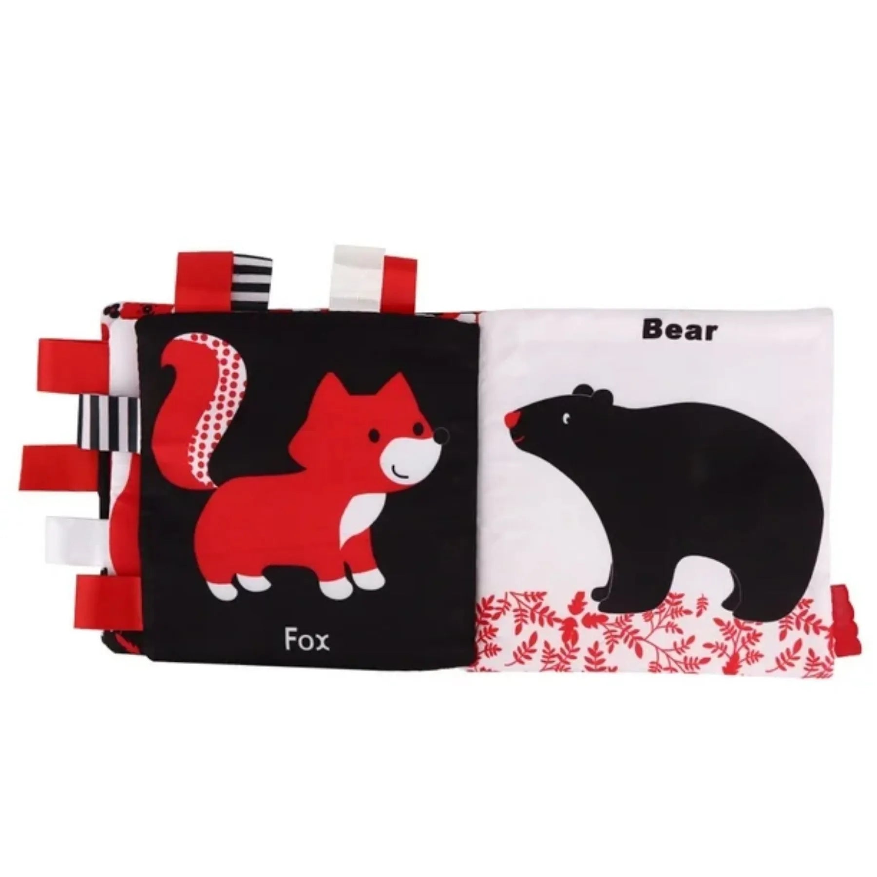Tu peque podrá aprender sobre los animales de la jungla, del océano y del bosque con nuestro Libro Sensorial Rojo y Negro.
