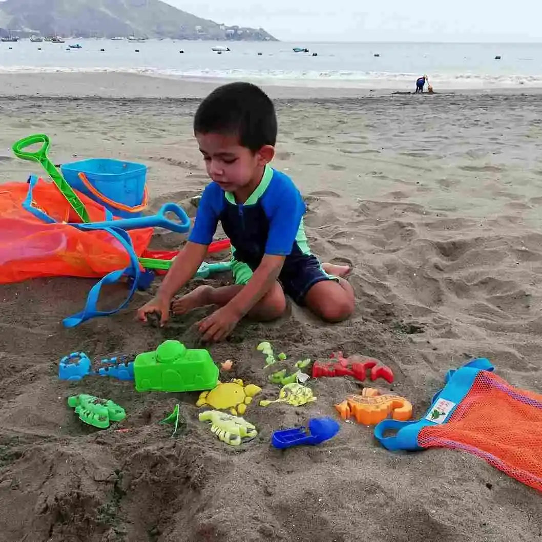 ¡Diversión asegurada en la playa! Esta práctica y colorida bolsa, está diseñada especialmente para los más pequeños. Fabricada con malla resistente y ligera, permite que la arena y el agua se filtren fácilmente, manteniendo los juguetes limpios y secos. Su diseño con compartimentos facilita la organización y su correa ajustable permite transportarla cómodamente.