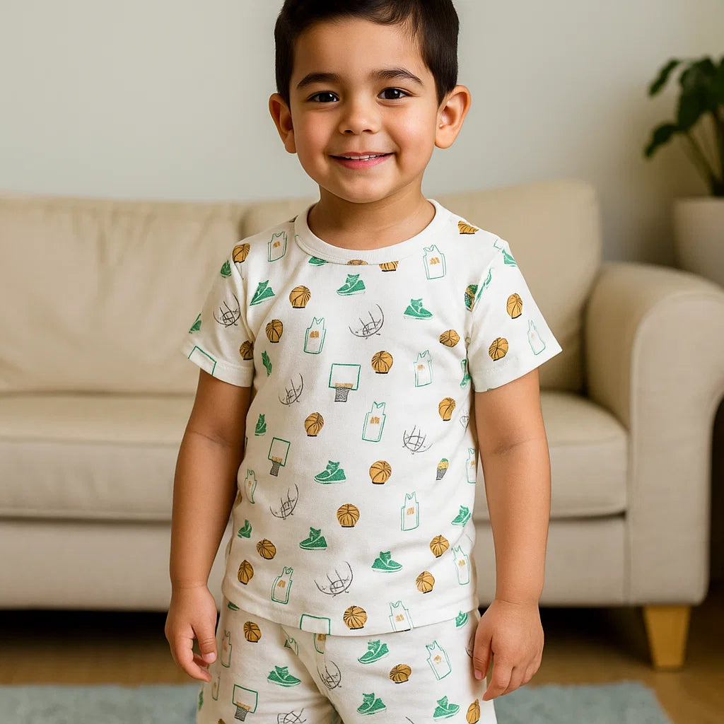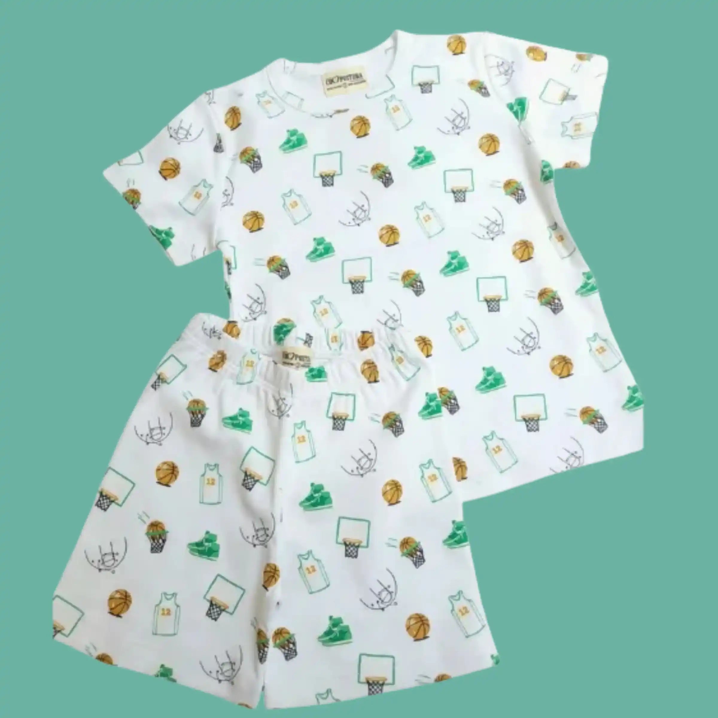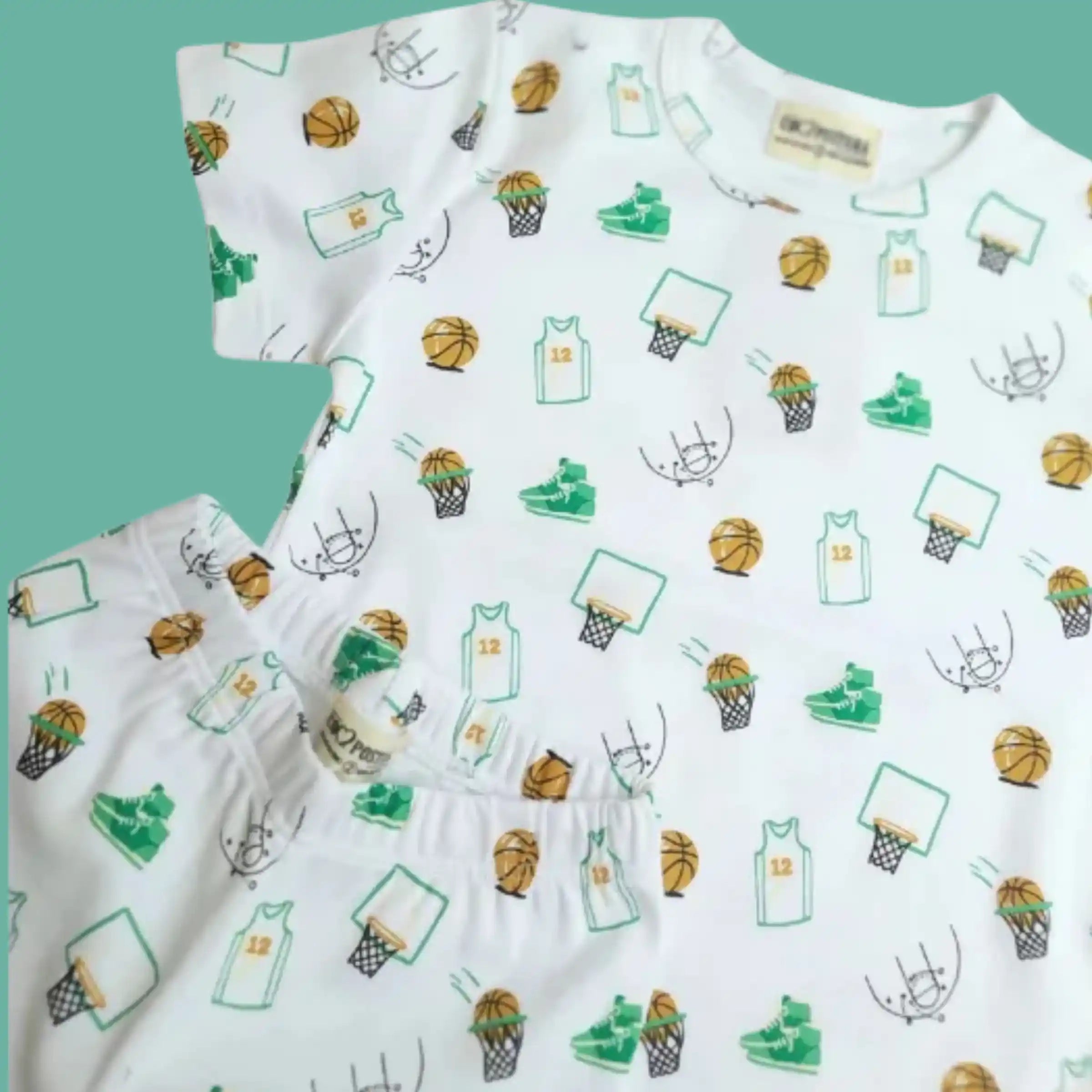Pijama Verano Baloncesto: Sueños tranquilos y abrazos suaves con pijamas de 100% algodón Pima, perfectos para noches llenas de dulzura. Con lindos estampados de lazos y flores consta de short y polo.