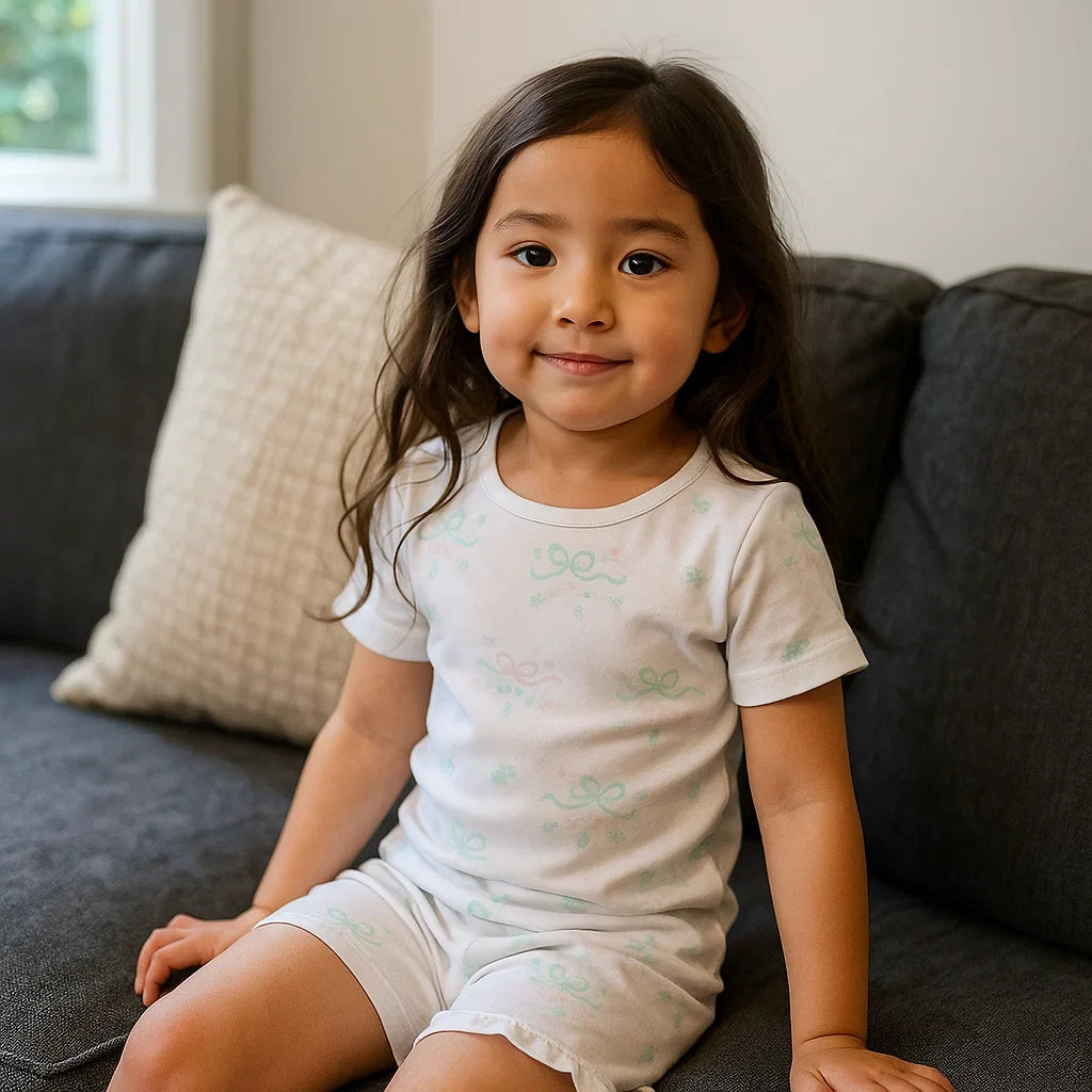 Pijama Verano Lazos: Sueños tranquilos y abrazos suaves con pijamas de 100% algodón Pima, perfectos para noches llenas de dulzura. Con lindos estampados de lazos y flores consta de short y polo.