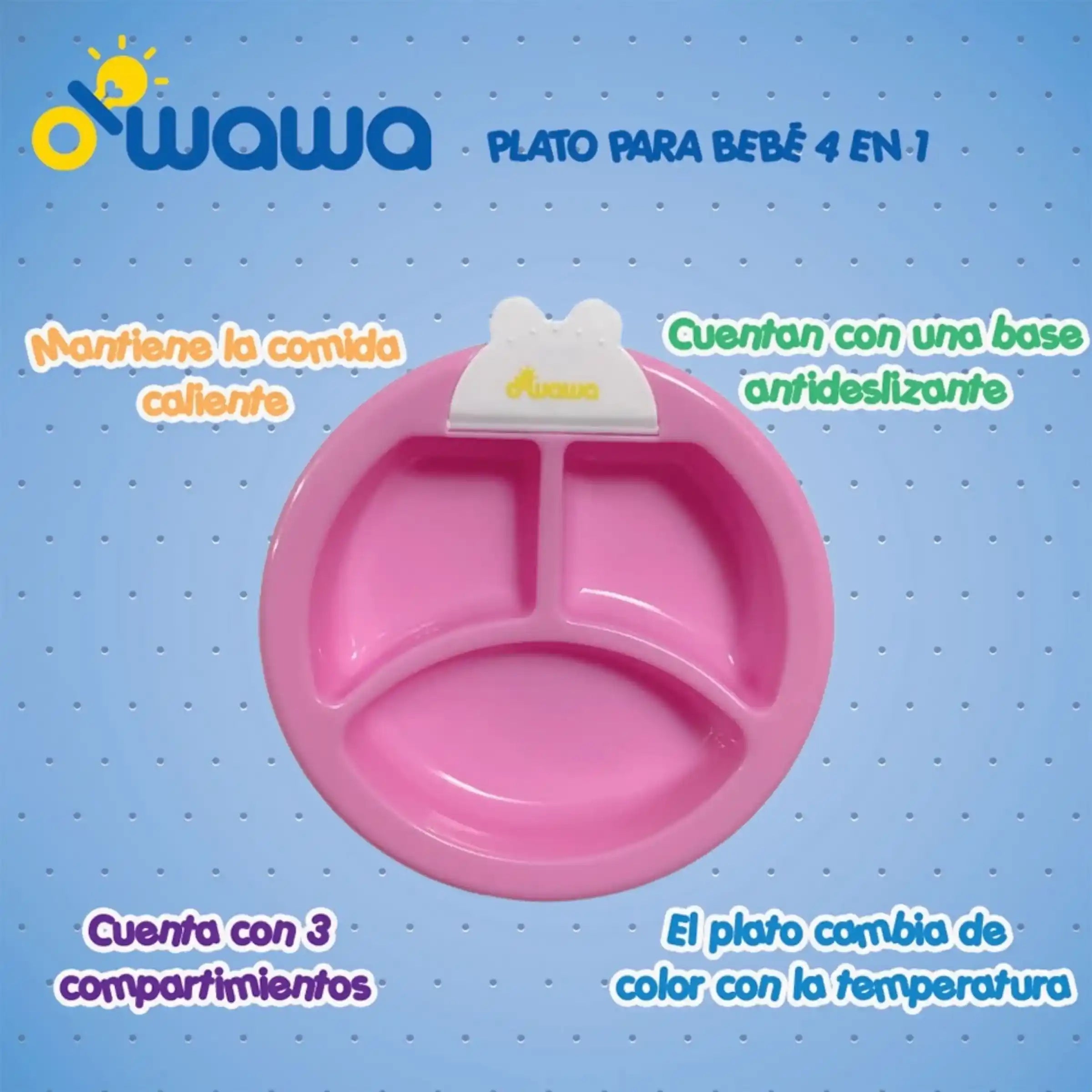 El plato para bebés Owawa 4 en 1 es un accesorio de alimentación para el cuidado infantil. Su diseño mantiene la comida caliente, cuenta con base de silicona antideslizante y 3 compartimientos. El plato cambia de color.