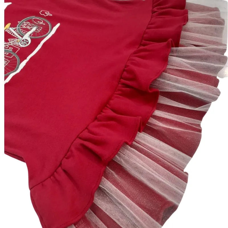 Polivestido de algodón para niña, con un diseño adorable que combina estilo y comodidad. La basta de la falda tiene blondas con tull que agregan un toque de feminidad y delicadeza. En el pecho, un estampado de una bicicleta con canasto lleno de flores es simplemente encantador, y los apliques de tull bordado en las flores le dan un toque de elegancia. Puedes combinarlo con panties o leggins para crear un outfit completo y adorable. ¡Un polivestido perfecto para que tu pequeña se sienta feliz y segura!