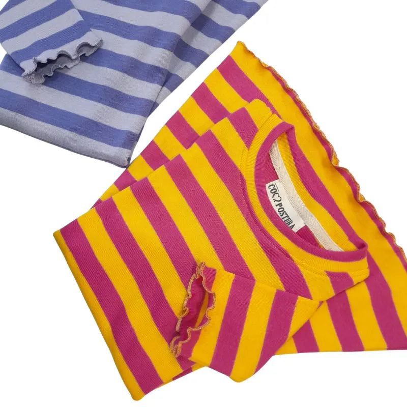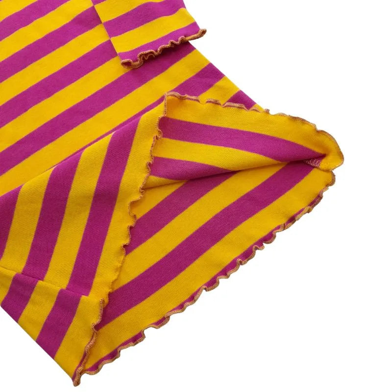 Polivestido manga larga para niña, hecho de algodón suave y fresco. Perfecto para la media estación. Un diseño divertido con franjas que le dan un toque juguetón. Las mangas y la basta tienen ondas pequeñas que agregan un toque femenino y delicado. Puedes combinarlo con un chaleco o panties para crear un outfit completo y adorable. ¡Un poli vestido versátil y cómodo para que tu pequeña se sienta feliz y segura!