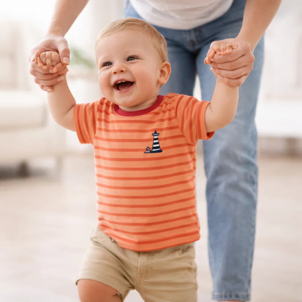 Nuestro polo manga corta de algodón pima , suave y fresco, ideal para el uso diario. Su diseño a rayas finas en naranja con cuello contrastado y delicado bordado de faro le da un toque clásico y encantador. Confeccionado en algodón pima de alta calidad, garantiza comodidad, durabilidad y suavidad para la piel de los más pequeños.