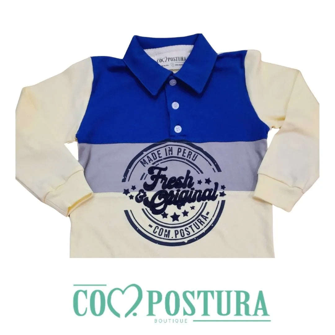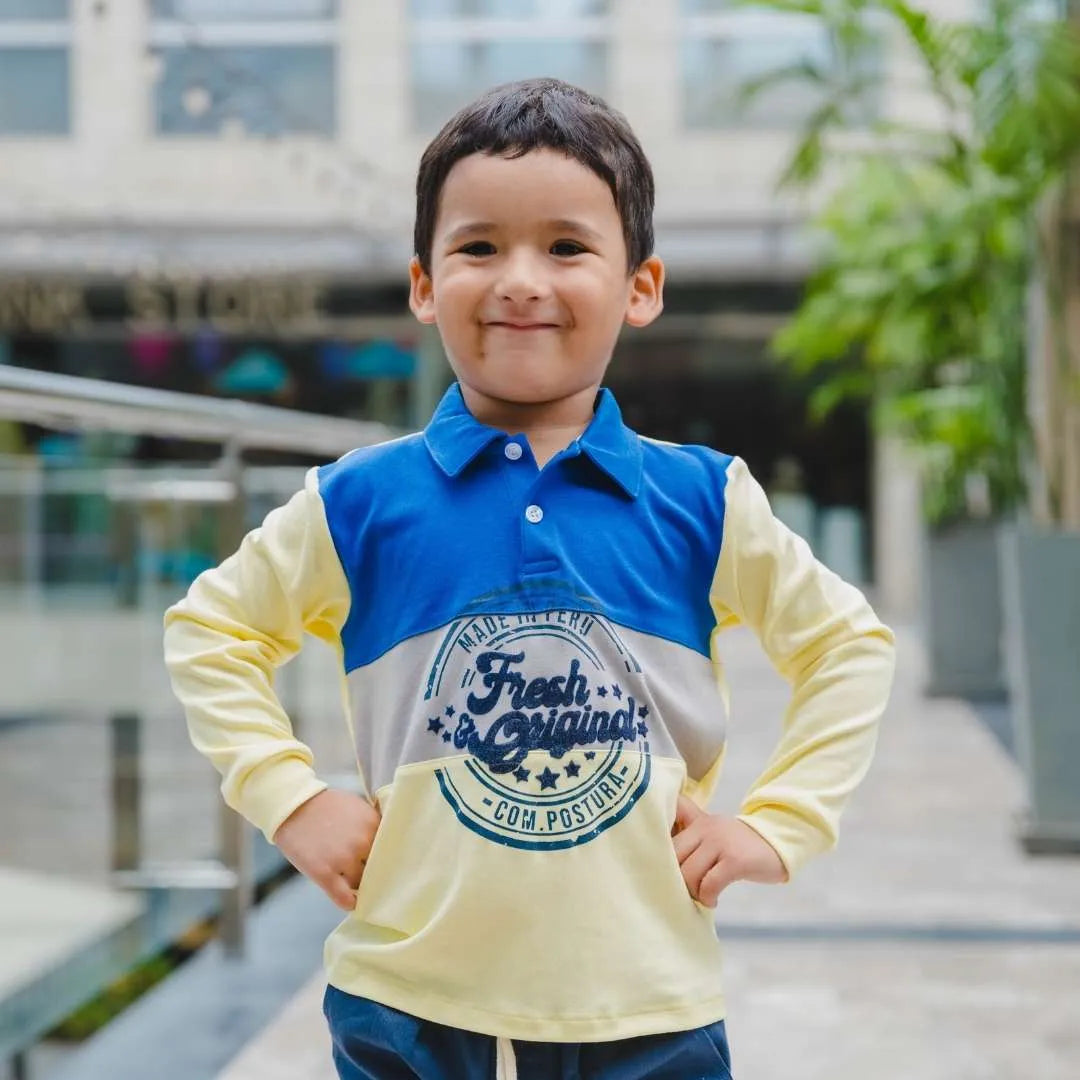 Nuestro polo manga larga de algodón pima es suave, transpirable y cómodo. Con un diseño divertido de cuello camisero, color amarillo y mangas azules, es perfecto para agregar un toque de estilo y personalidad a su outfit diario.