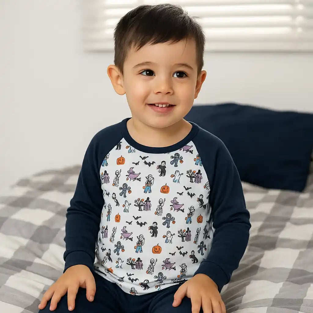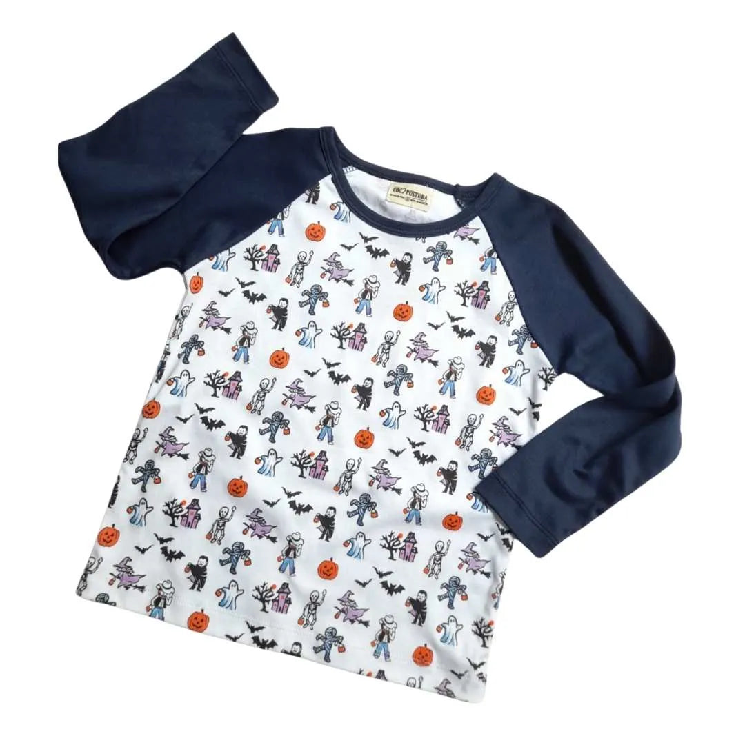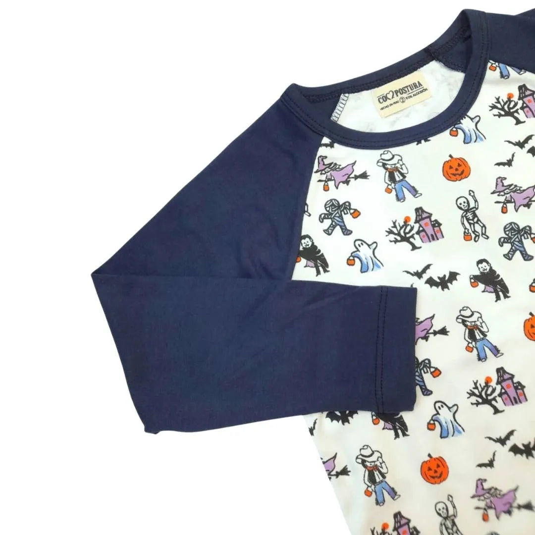 Nuestro polo manga larga azul Agustín es suave, transpirable y cómodo. Con un estampado emocionante de Halloween en algodón pima, es perfecto para que tu pequeño se una a la fiesta más aterradora del año.