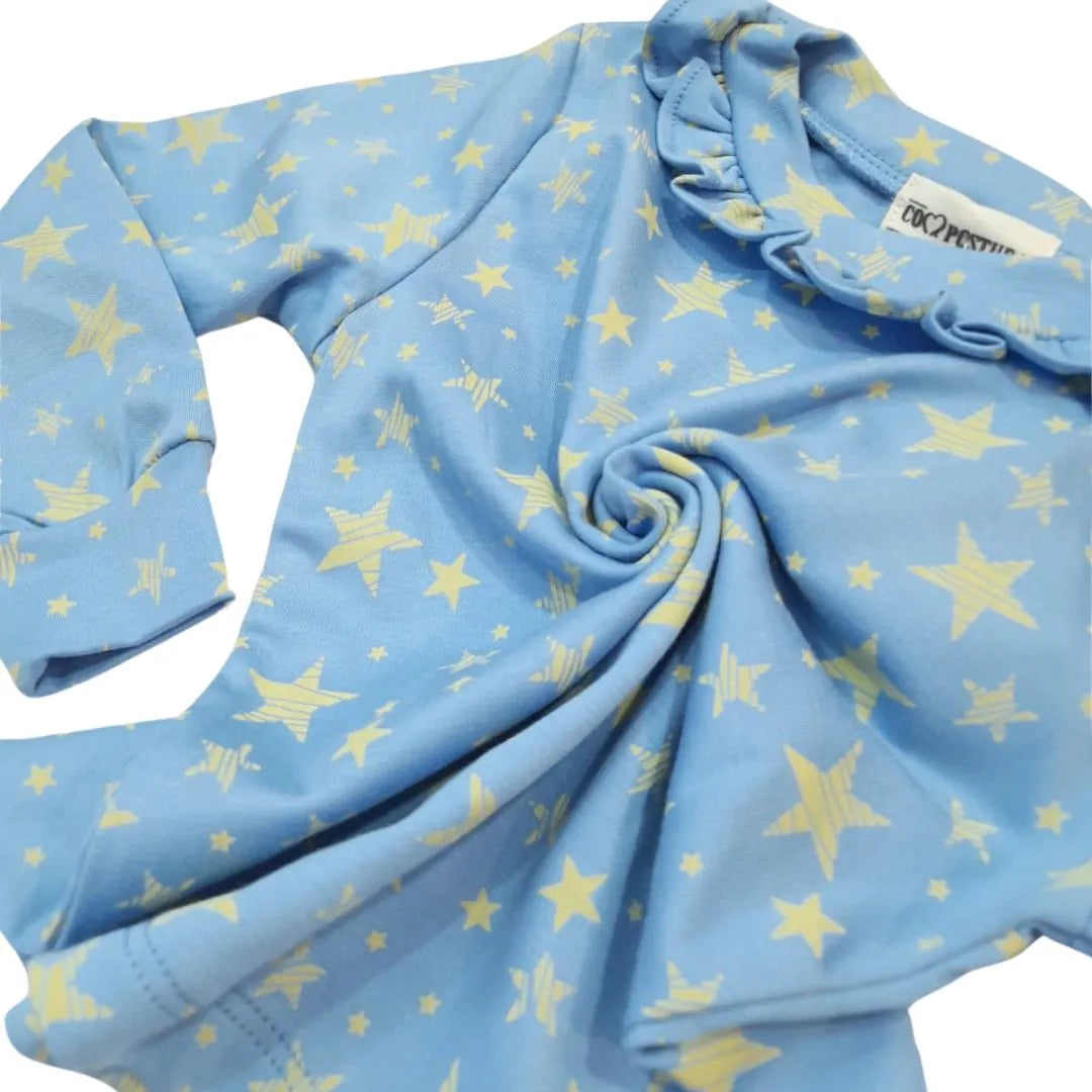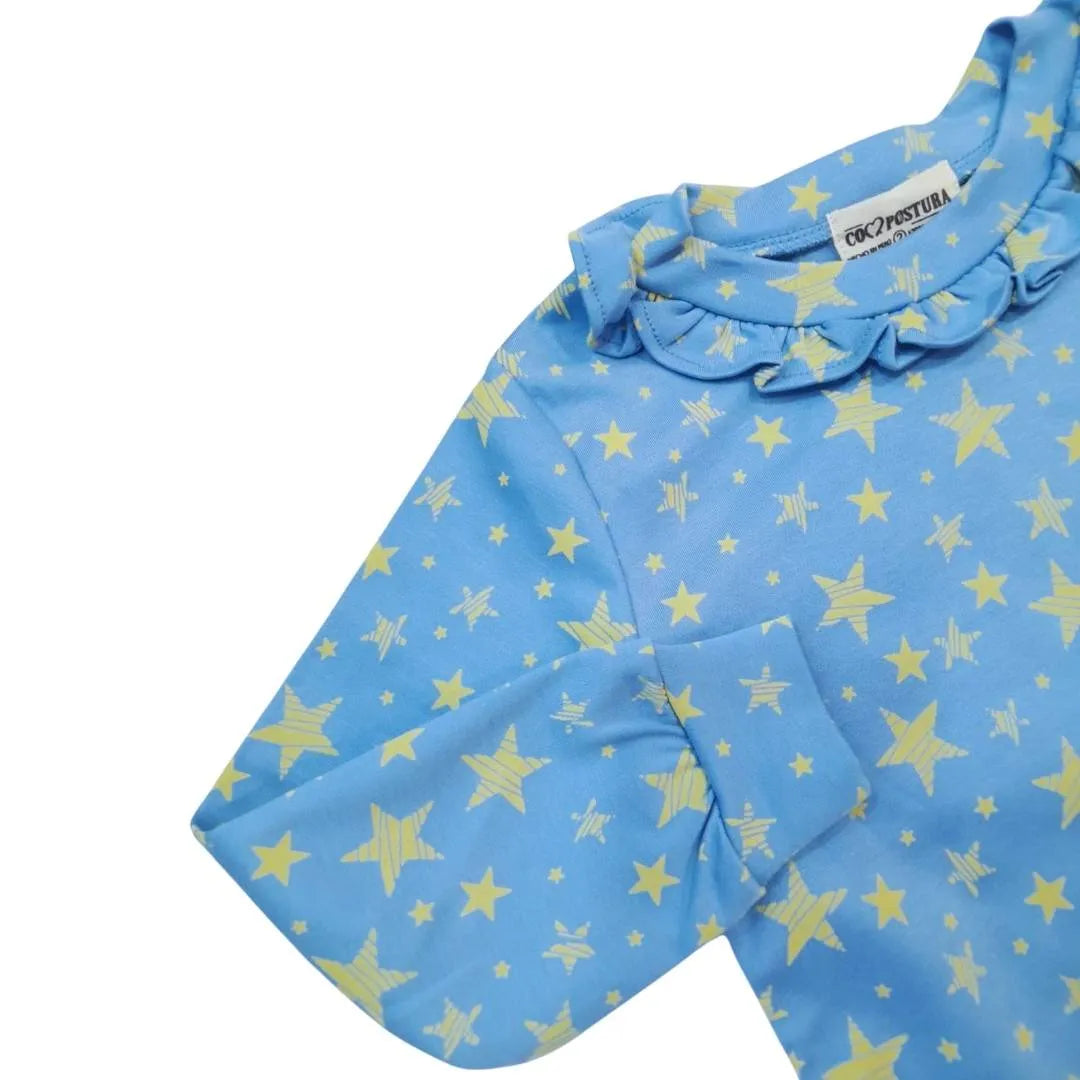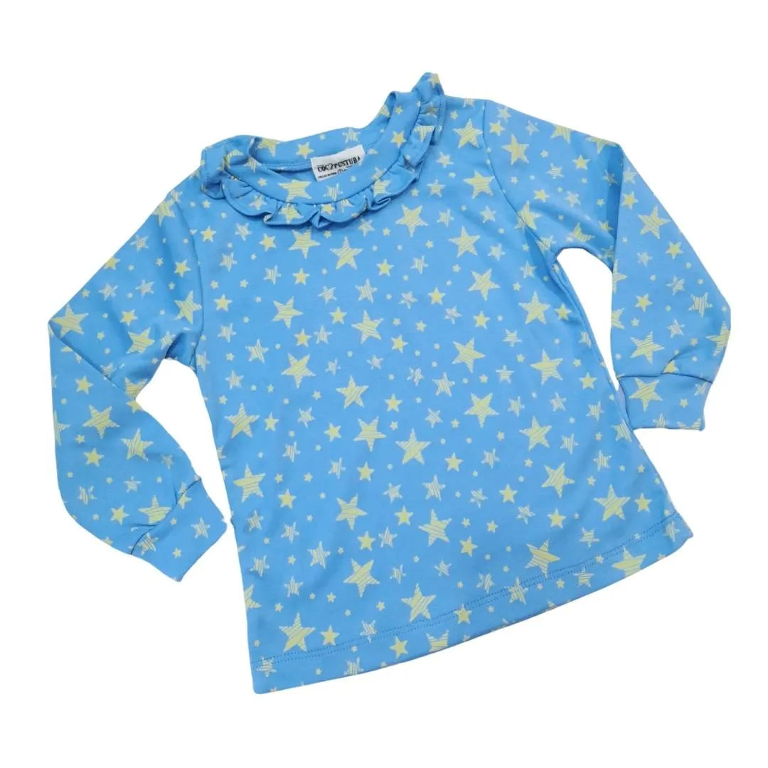Nuestro polo manga larga Celeste Agustina es suave, transpirable y cómodo. Con un estampado mágico de estrellas y detalle de blondas en en cuello es perfecto para agregar un toque de elegancia y fantasía a su outfit diario.