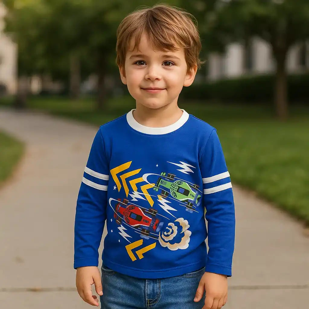 Con un estampado emocionante de un auto de carrera, franjas deportivas en las mangas y tela suave y transpirable, este polo es perfecto para niños que aman la velocidad y la aventura.
