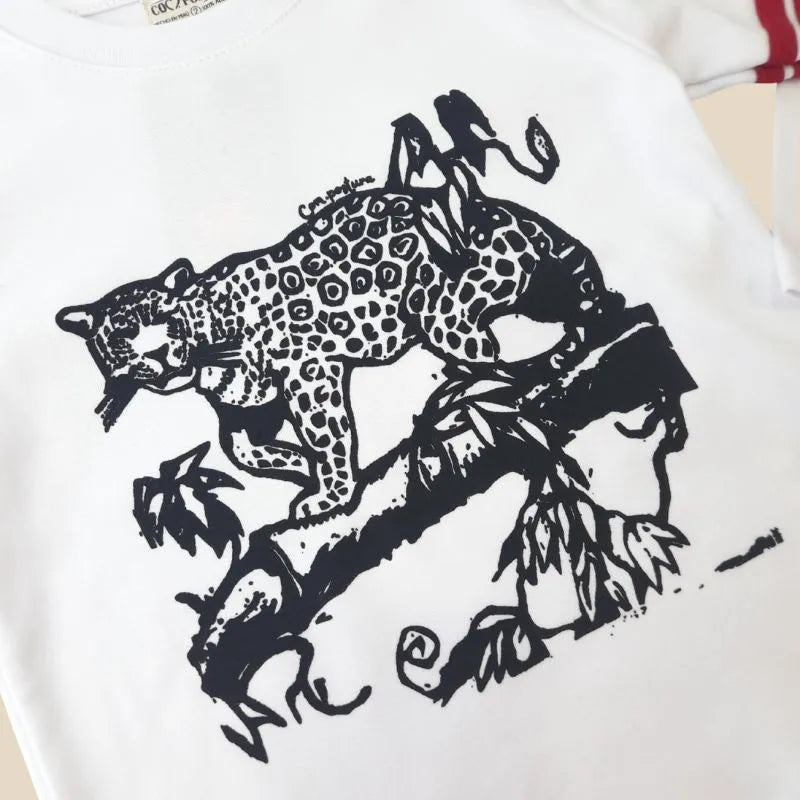 Polo de manga larga de algodón, inspirado en la riqueza de la Amazonía peruana. Franjas en las mangas que evocan la exuberancia de la selva, y en el pecho, el majestuoso otorongo, símbolo de la fuerza y la belleza de nuestra Amazonía. Un diseño que combina estilo y conexión con la naturaleza. ¡Viste con orgullo y representa la esencia de la Amazonía!