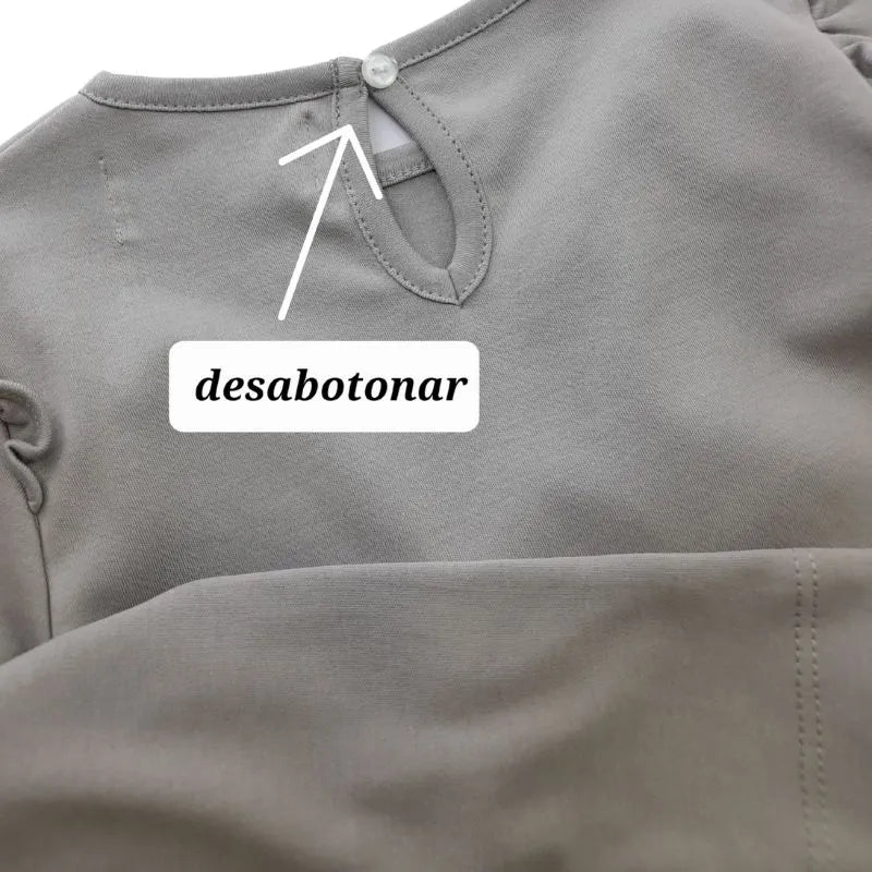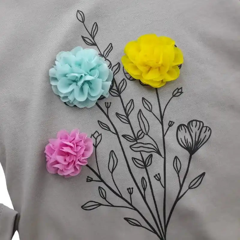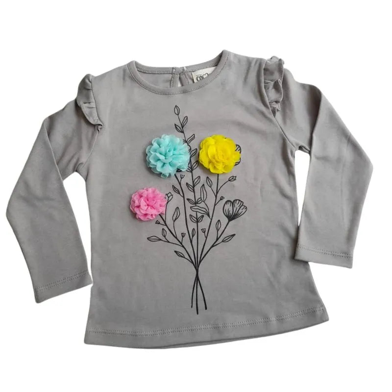 Polo manga larga para niña, en tonos gris y blanco, hecho de algodón súper fresco. Un estampado de ramo de flores que es simplemente adorable, con aplicaciones de seda en las flores que le dan un toque de elegancia. En el hombro, detalles de blondas que agregan un toque femenino y delicado. Y para facilitar la vida, un botón en la parte trasera para que ponerse el polo sea pan comido. ¡Un diseño que combina estilo, comodidad y frescura para que tu pequeña se sienta una princesa!