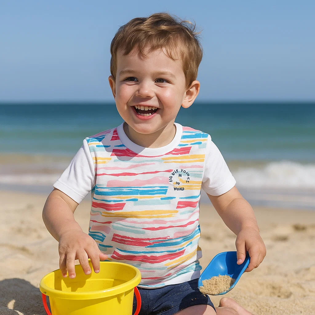 En la parte delantera destaca un estampado de colores inspirado en el estilo surf, vibrante y divertido, perfecto para niños que aman el verano, la playa y los outfits con actitud. Su diseño es ligero, cómodo y fácil de combinar, convirtiéndolo en una prenda infaltable para el día a día.