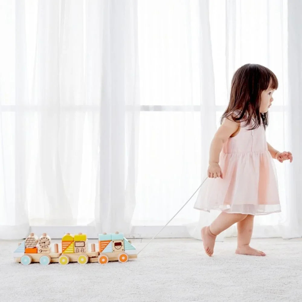 Tren de madera con bloques y formas extraíbles que estimulan la creatividad y mejoran las habilidades motoras.