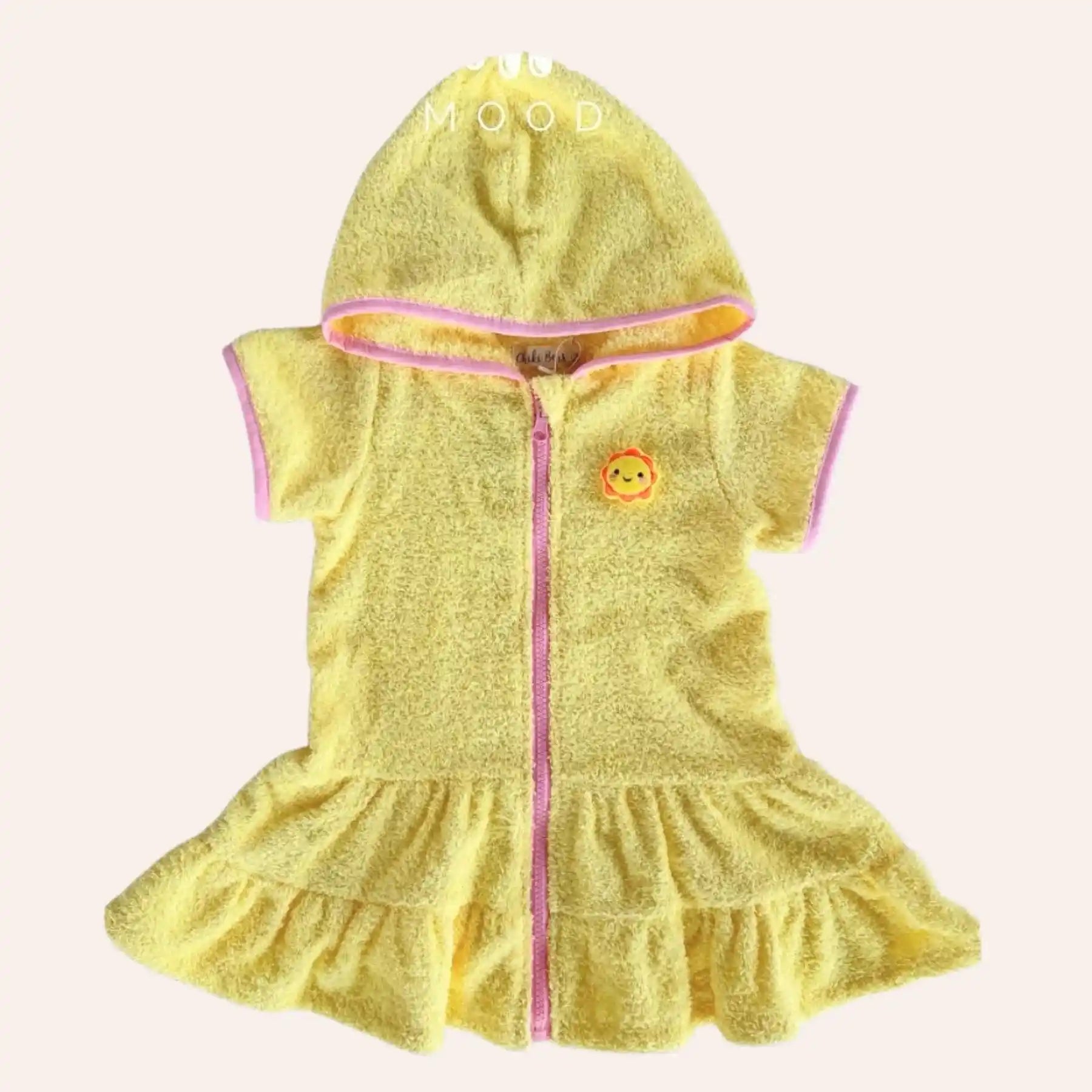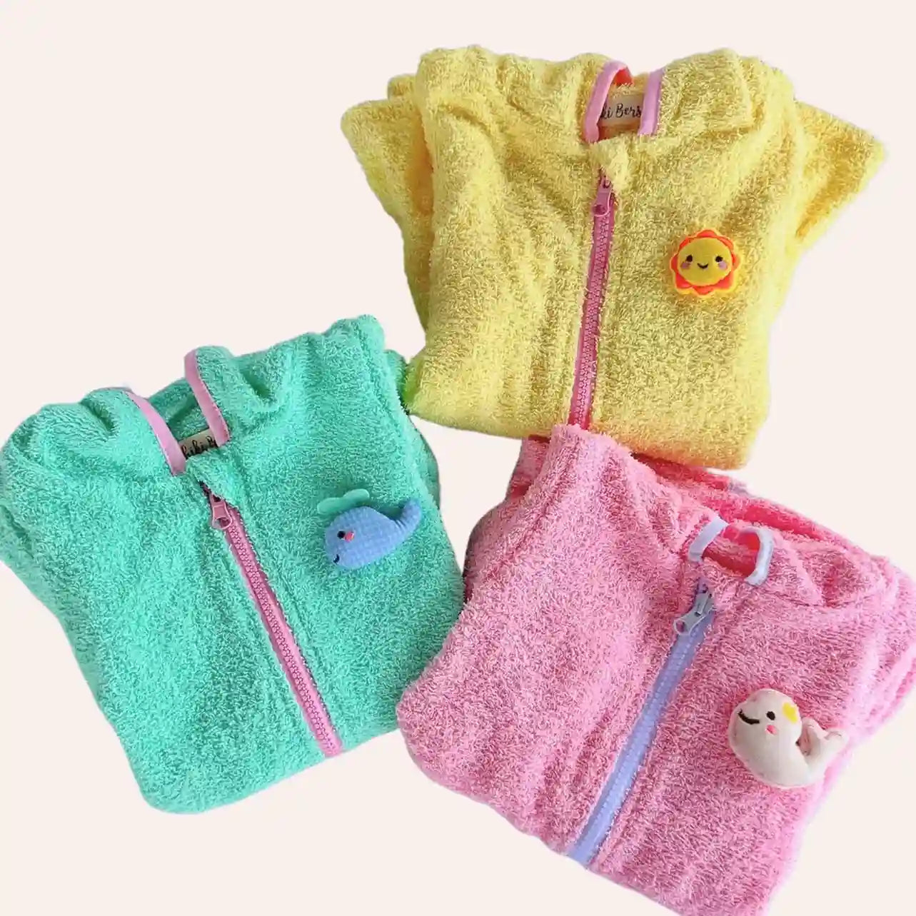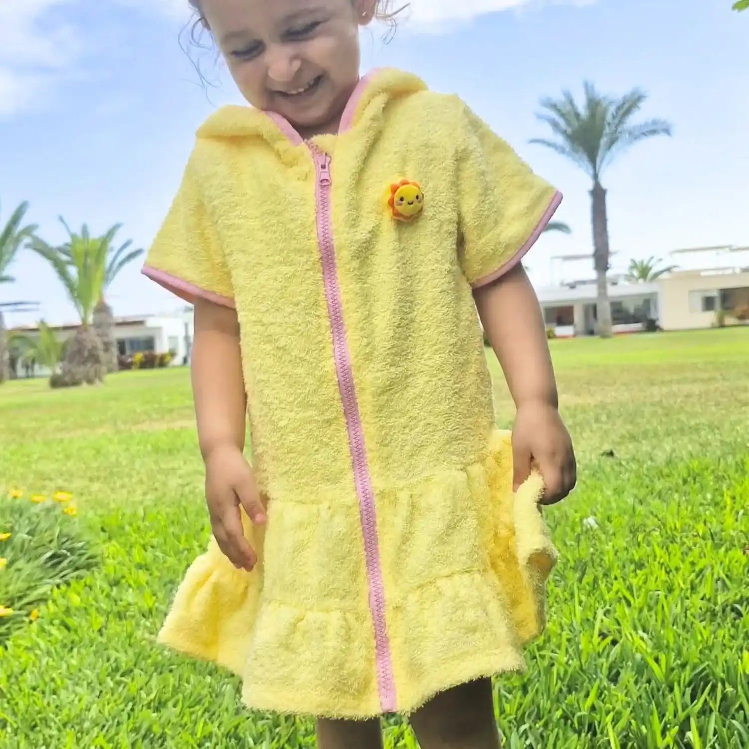 Bata infantil con capucha y cierre delantero, confeccionada en tela toalla suave y absorbente. Ideal para usar después del baño, en la piscina o la playa, brindando comodidad y protección a los más pequeños.