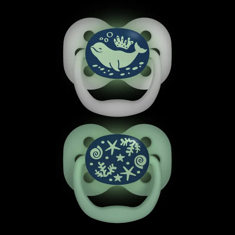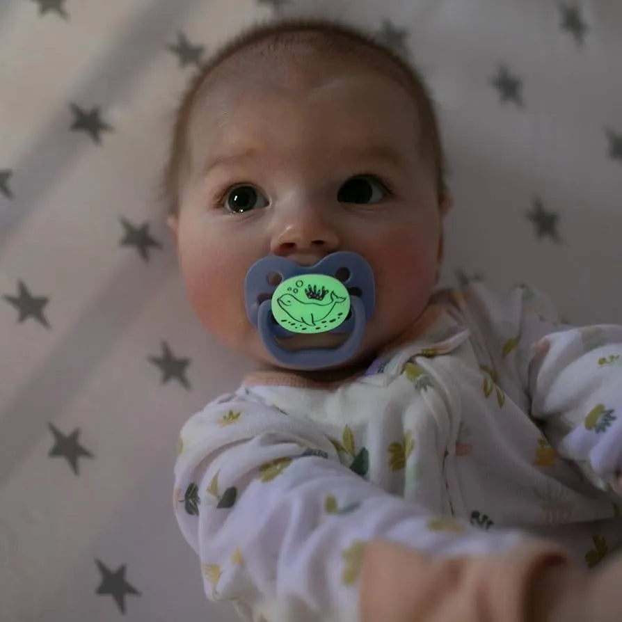 - Su diseño de escudo único reduce la irritación al proporcionar suficiente aire para que respire la piel sensible del bebé. Además, brilla en la oscuridad, lo que facilita su localización de día o de noche.