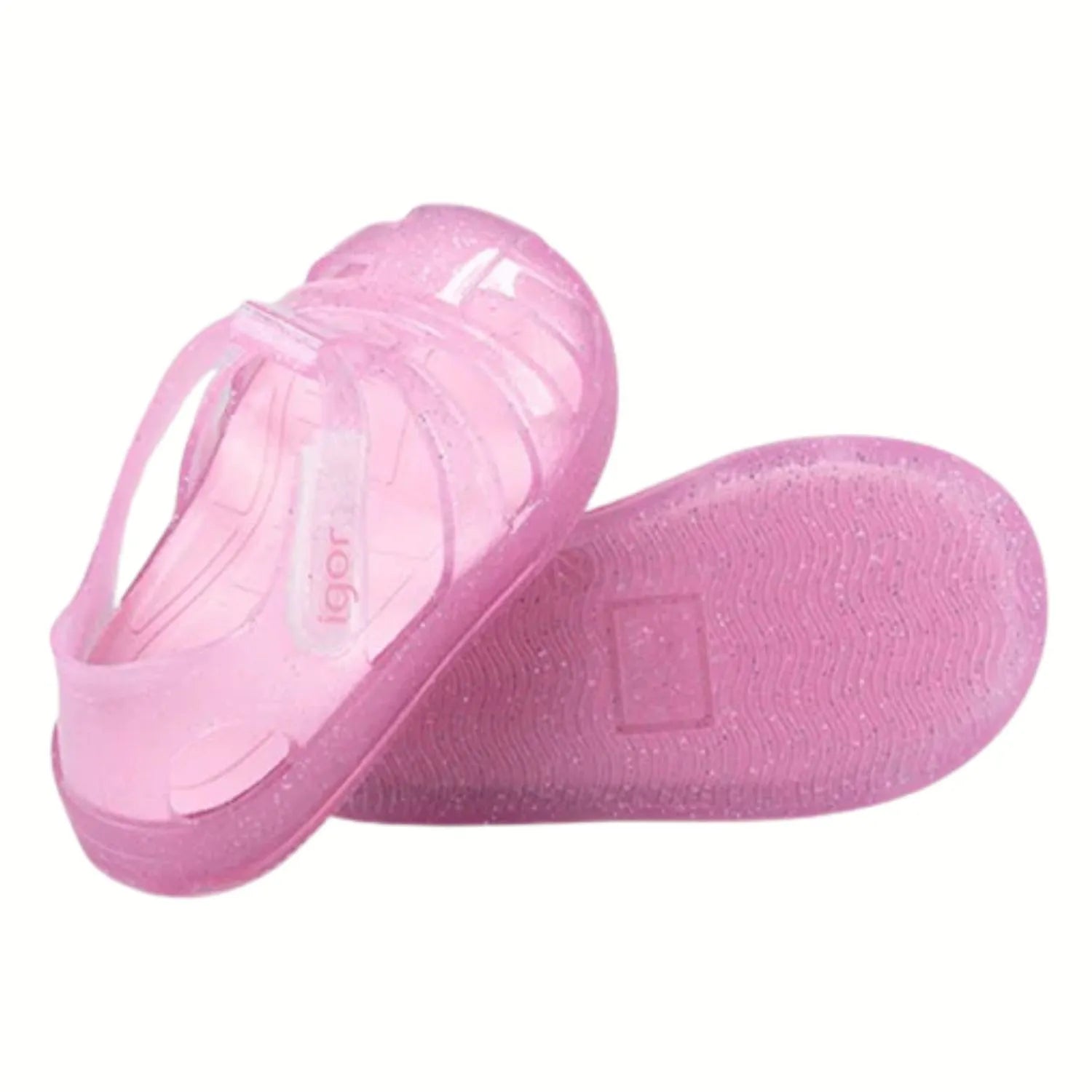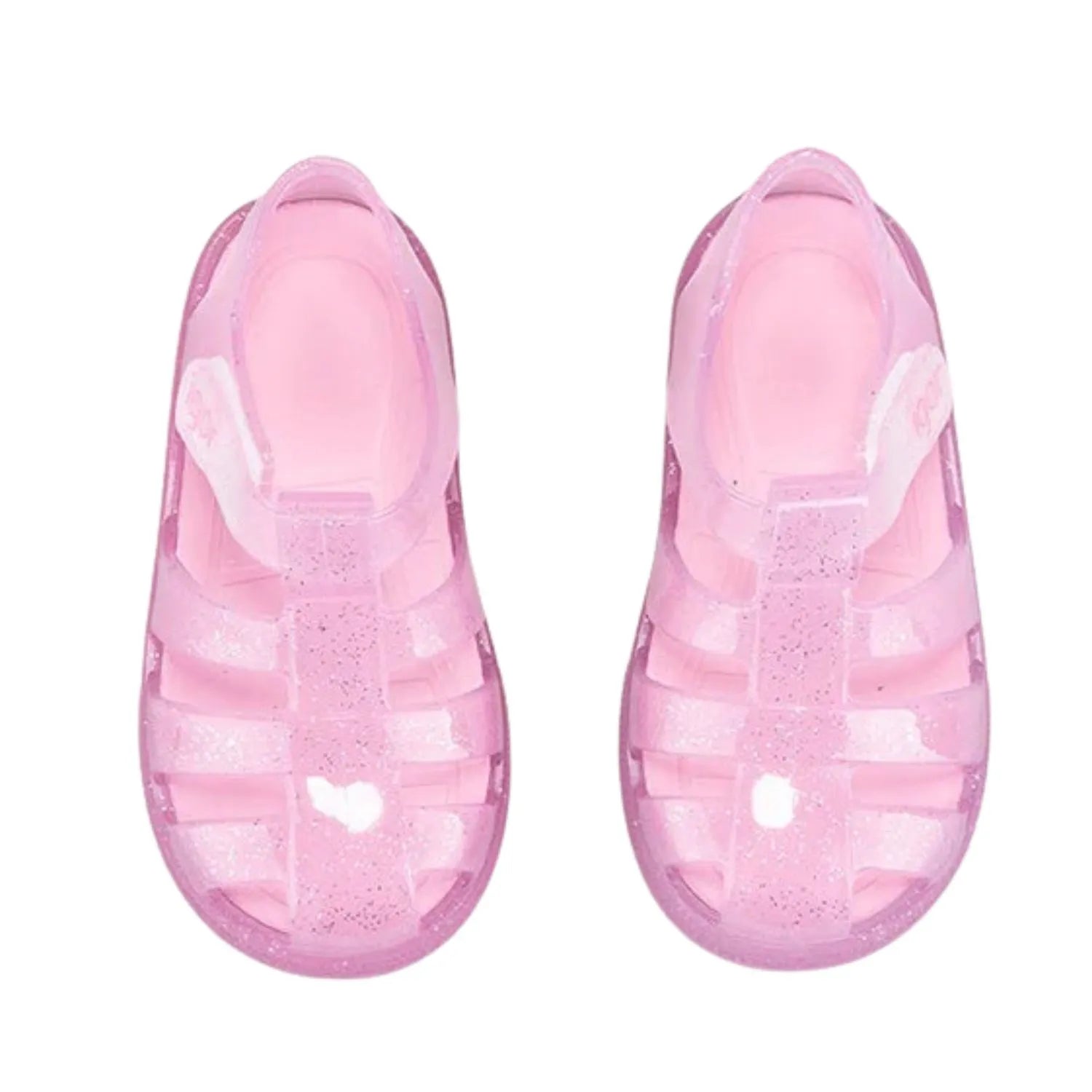 Sandalias STAR, material translucido de colores vibrantes, con brillantes de glitter y suelta del mismo color. Perfectas para la playa, la piscina o para disfrutar del día a día con total comodidad. Su diseño en PVC inyectado en una sola pieza ofrece resistencia y flexibilidad, mientras que el cierre en velcro al tobillo permite un ajuste fácil y seguro. Además cuenta con una plantilla confort extraíble.