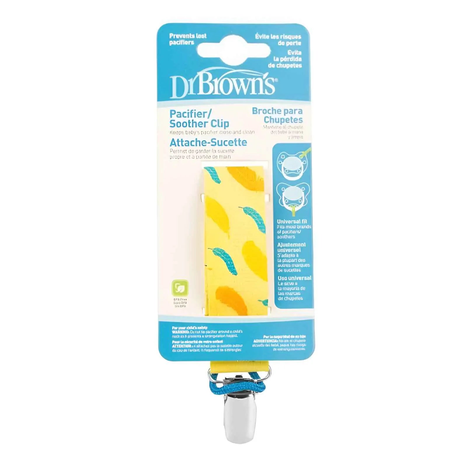 Sujetador para Chupones Dr. Brown´s de Tela Estampada Amarillo. Se coloca fácilmente sobre la ropa de tu bebé, debido al gancho que sujeta. Con esto no se le caerá el chupón al pequeño ni sufrirá de las constantes perdidas, o que el chupón se contamine si cae en un espacio sin limpieza. El sujetador tela estampada AMARILLO se adapta a la mayoría de Chupones. Viene en un hermoso estampado AMARILLO, que entretendrá a tu bebé. Es fácil de colocar y se ajusta con una sola pieza a la ropa de tu bebé. No incluye chupón.