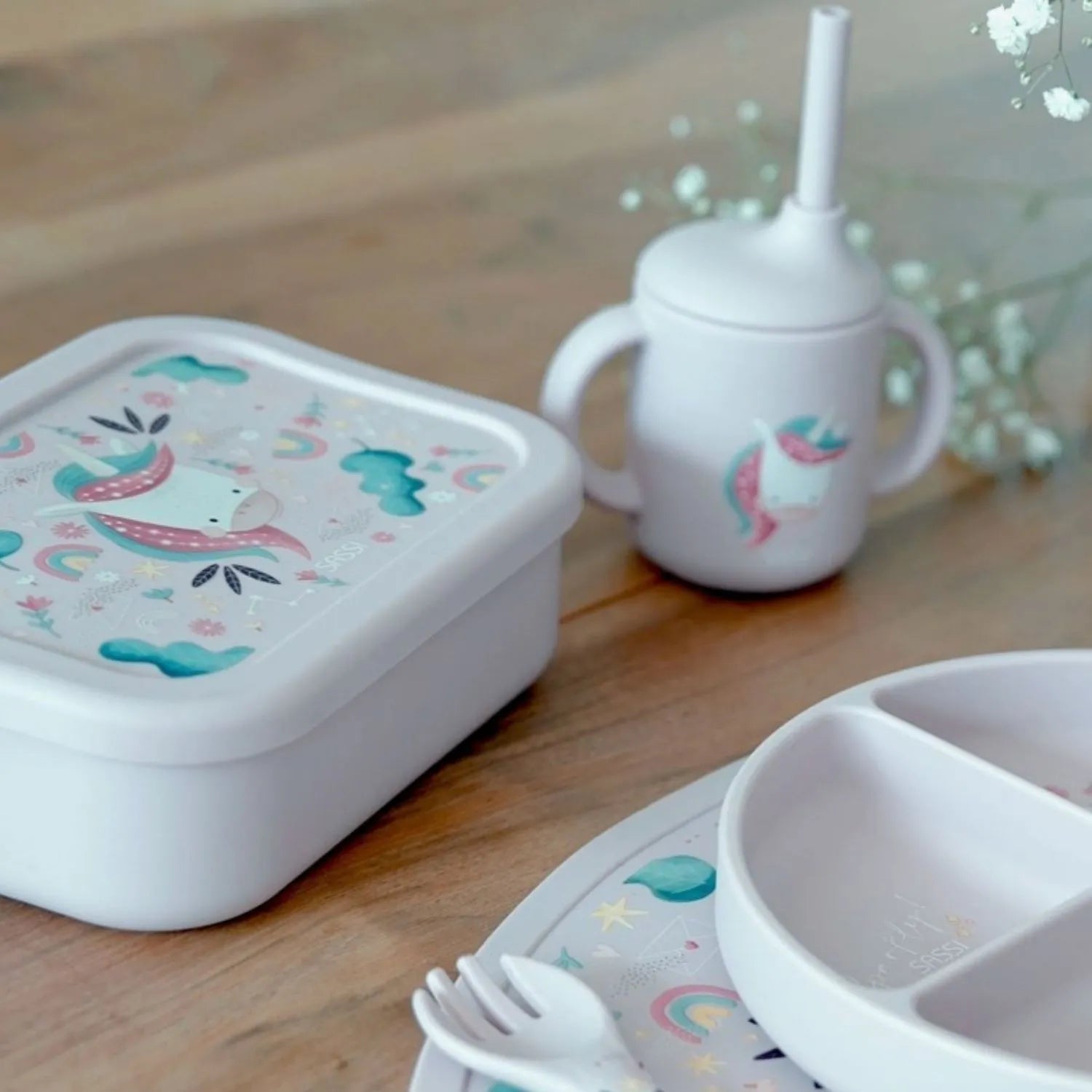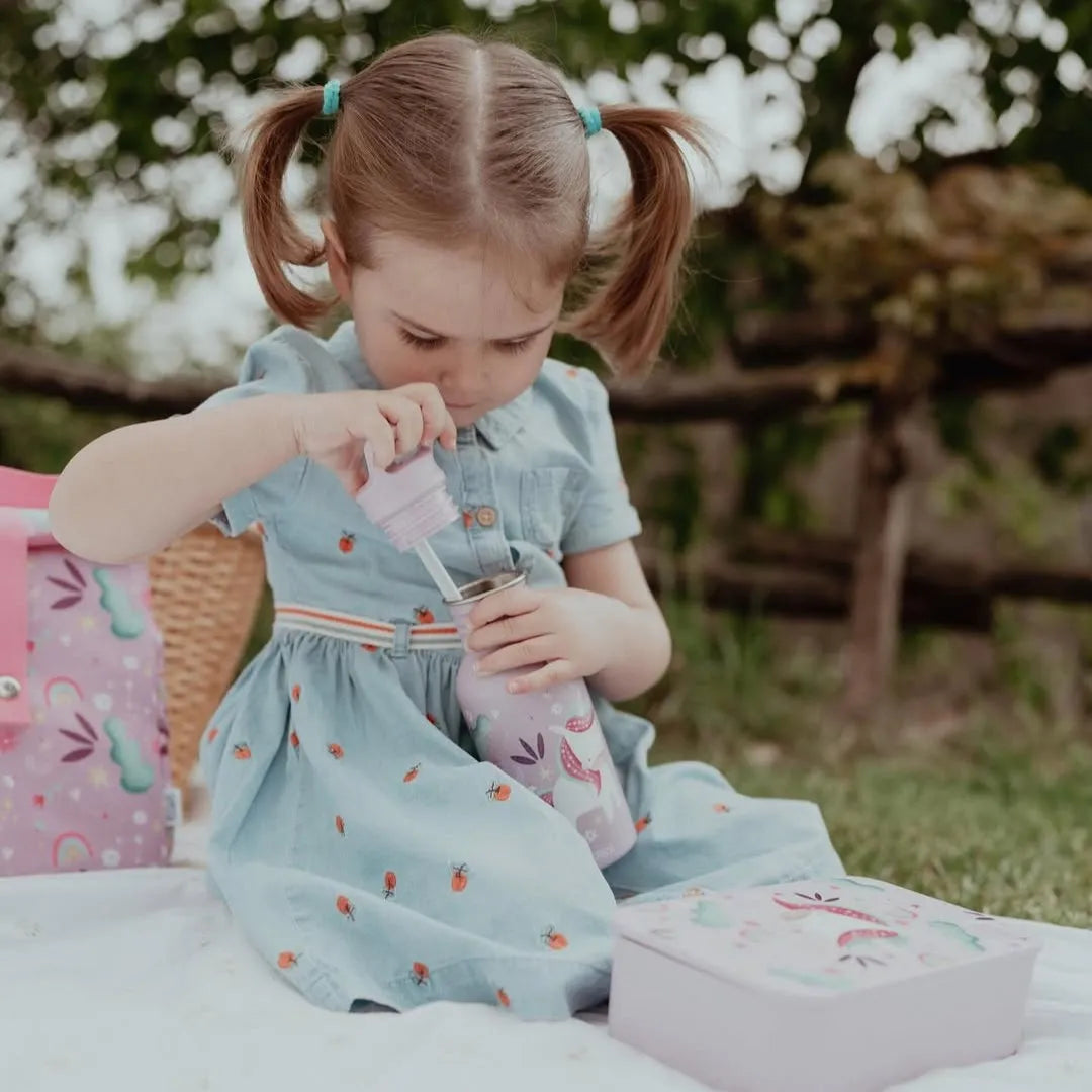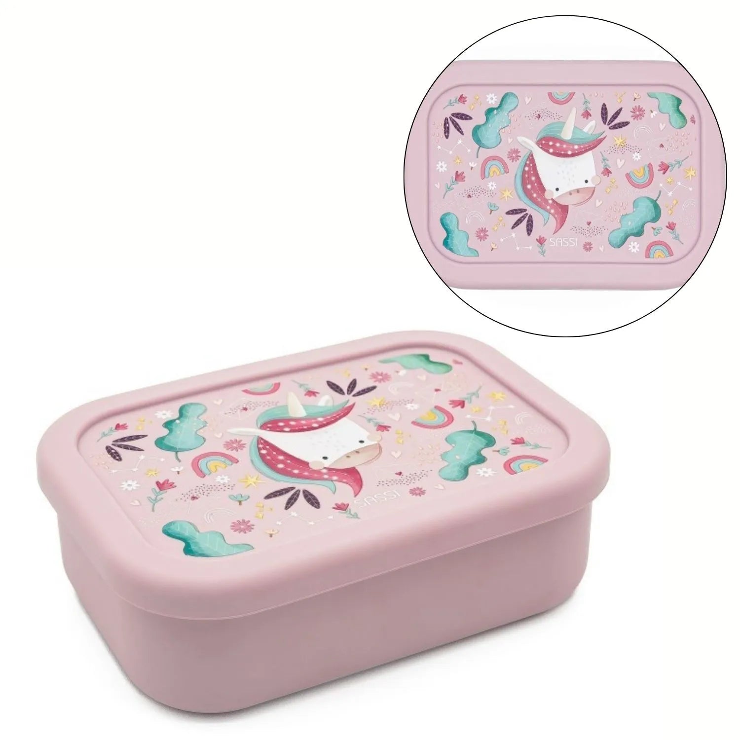 La lonchera Sparkly El Unicornio de silicona para niños pequeños, es el recipiente perfecto para la merienda escolar.