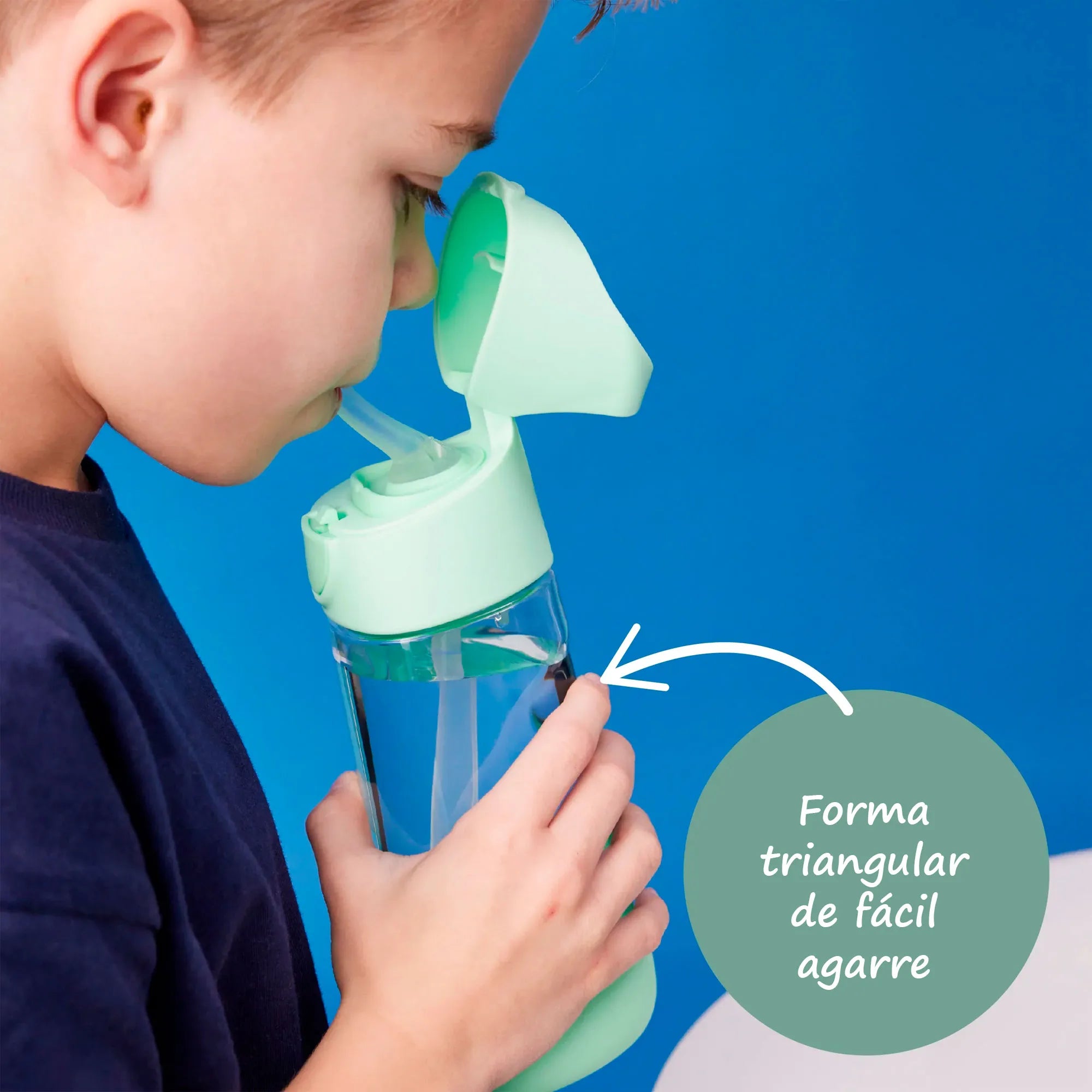 Botella ergonómica única con forma triangular que se adapta perfectamente al agarre de dos manos de un niño.