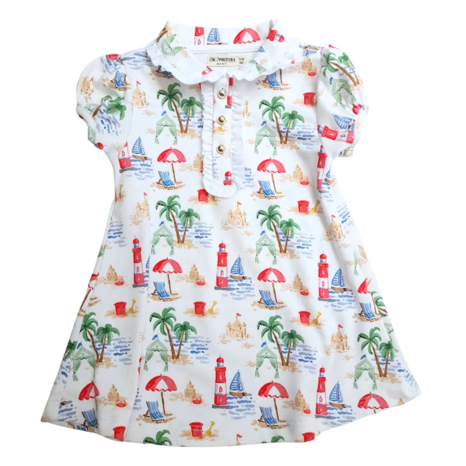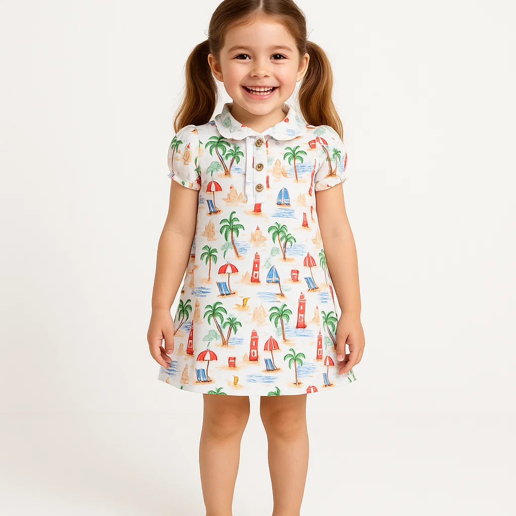 Cuenta con un encantador cuello bebé con acabado en blonda, que resalta su dulzura, y tres botones dorados decorativos al frente que aportan un toque sofisticado. Sus mangas bobas añaden volumen sutil y movimiento, mientras que la falda de corte en A garantiza libertad al caminar y un ajuste perfecto.