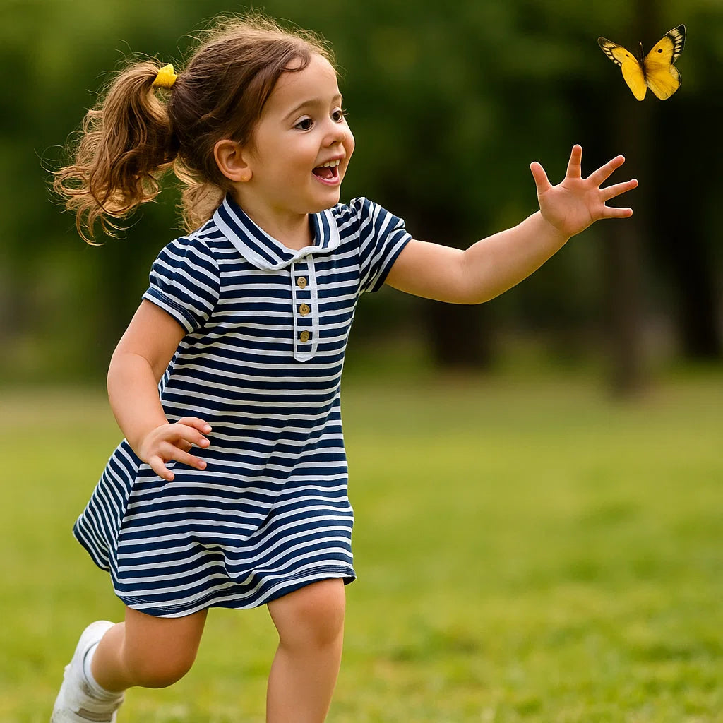 Un diseño clásico lleno de ternura y frescura. Nuestro vestido de algodón pima a rayas azules – Edición Náutico está pensado para que tu niña luzca cómoda, delicada y con un estilo atemporal en cada ocasión especial.