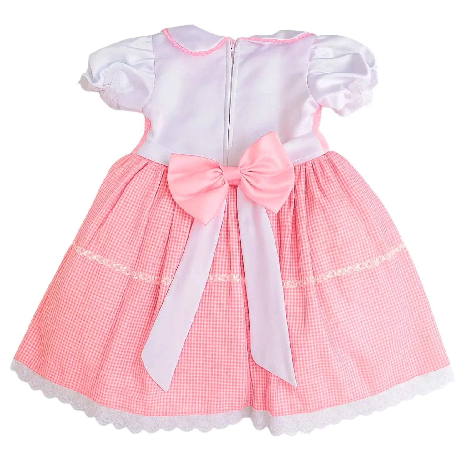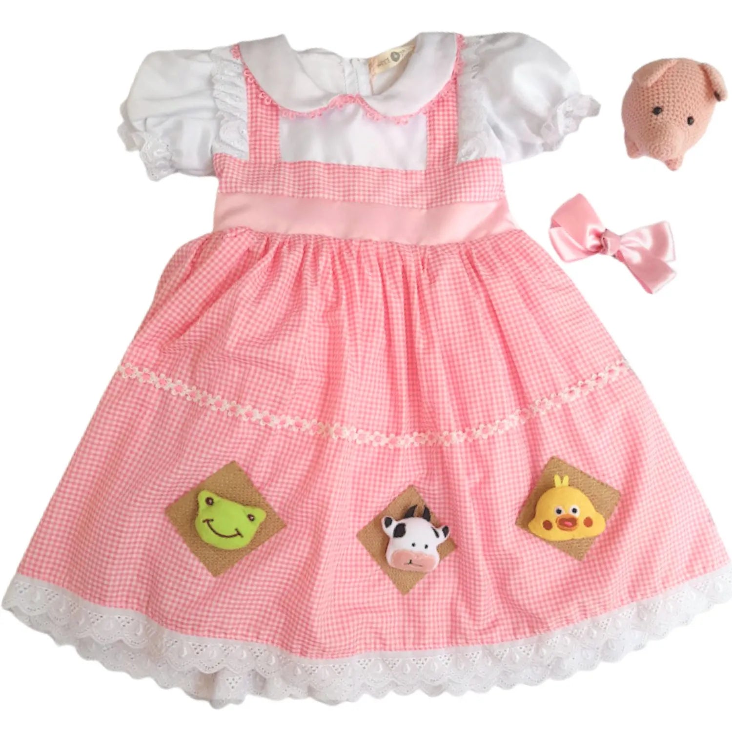 Deja que tu pequeña brille con este adorable vestido inspirado en este personaje tan amado. Su diseño combina tonos rosados de cuadros con detalles de animales que evocan la magia y dulzura del icónico personaje de campo.