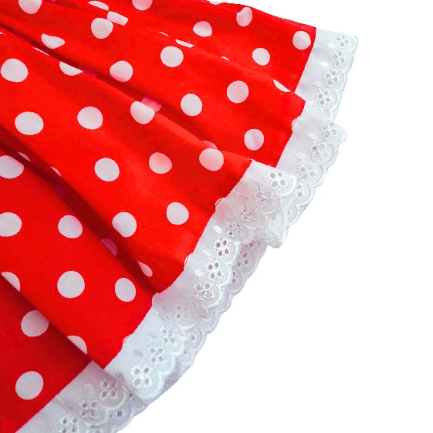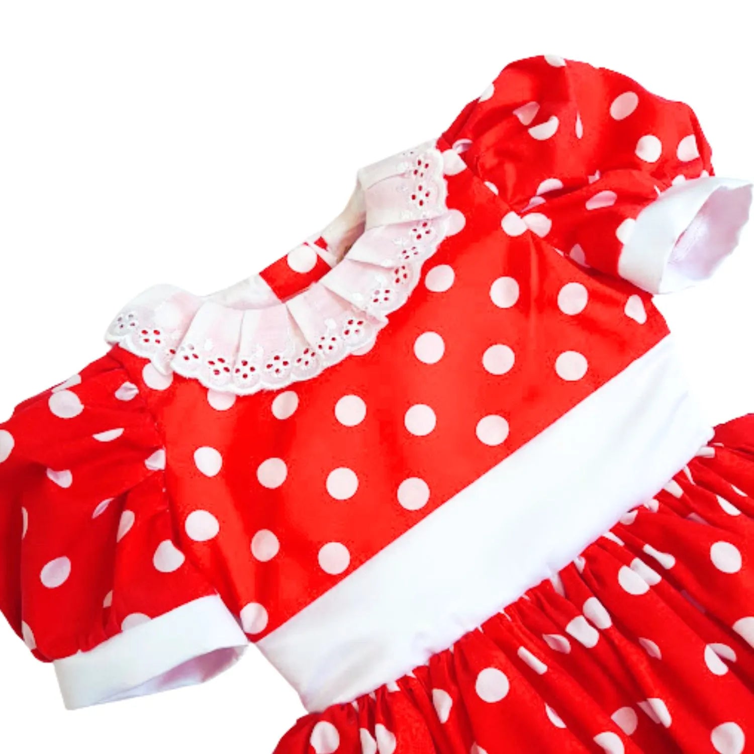 Deja que tu pequeña brille con este adorable vestido inspirado en Minnie. Su diseño combina tonos rojos y blancos clásicos con detalles de blondas blancas que evocan la magia y dulzura del icónico personaje.