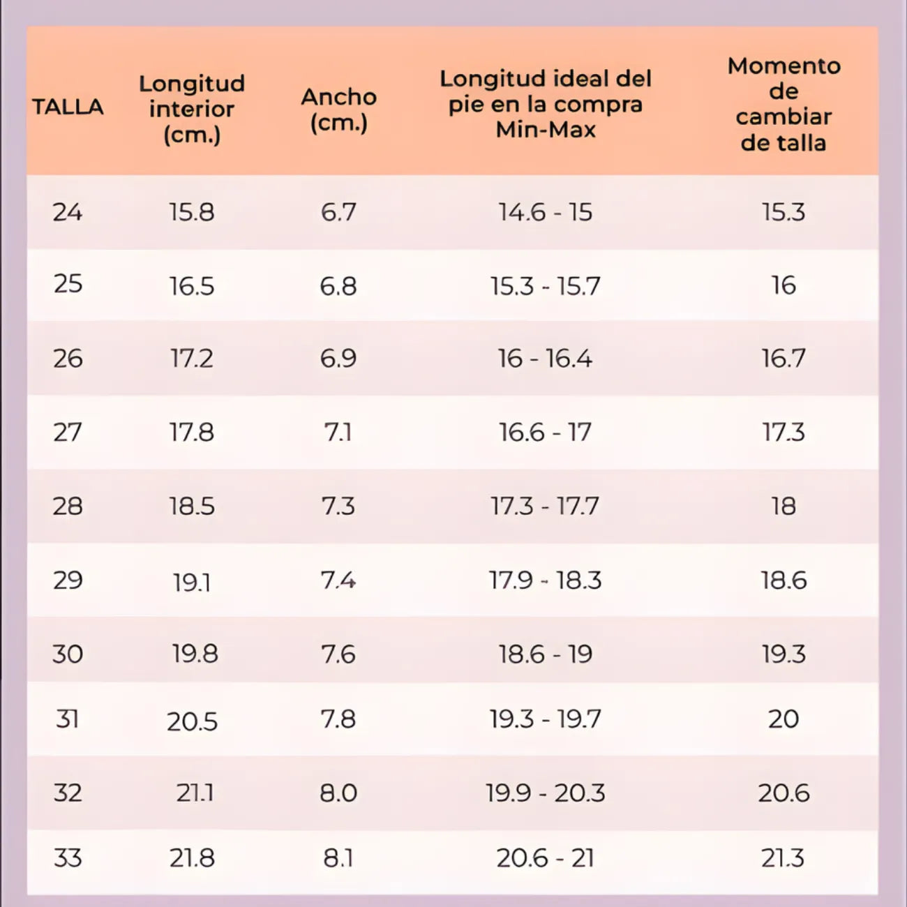 💡 Recuerda dejar un margen entre 0,8cm y 1,2cm entre el pie del peque y la medida de la plantilla. Si necesitas ayuda para saber qué talla elegir, contacta con nosotras al 965 862 729 estaremos encantadas de ayudarte.